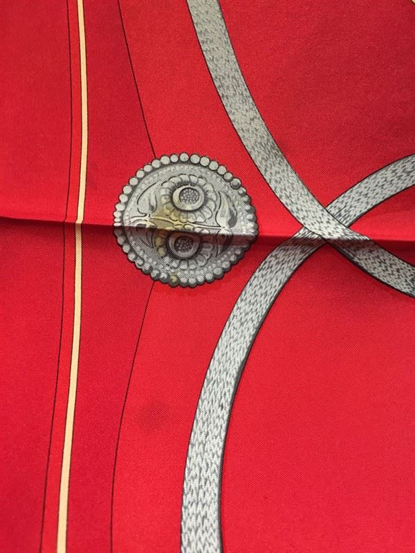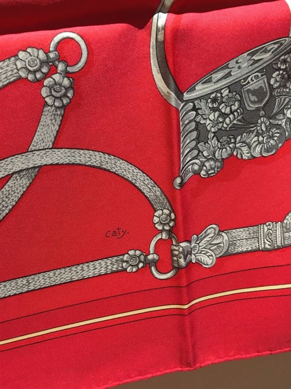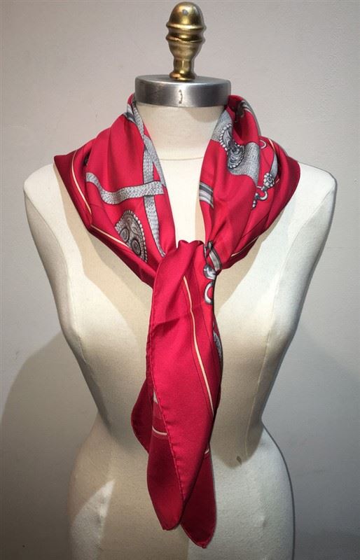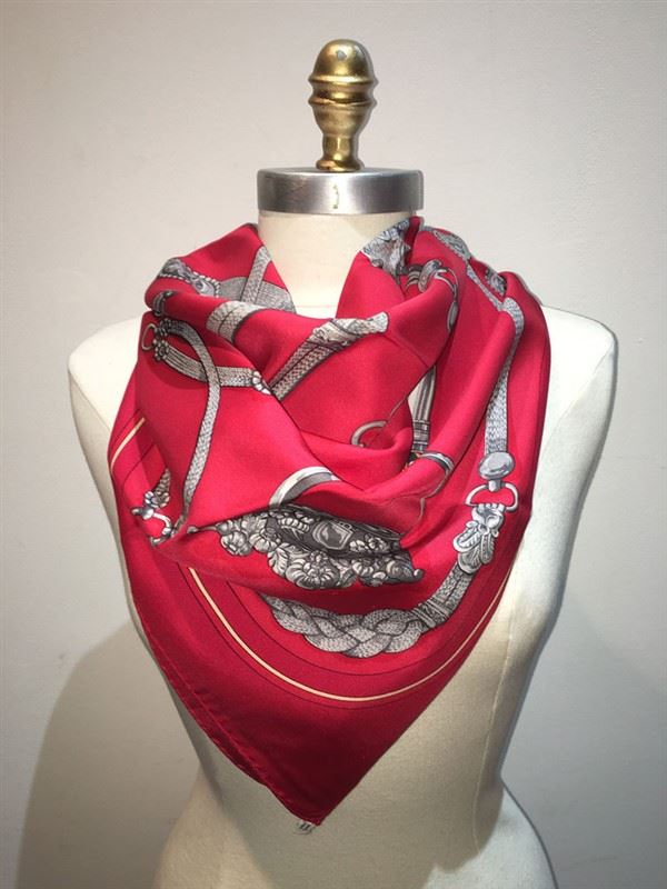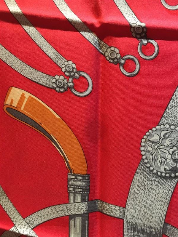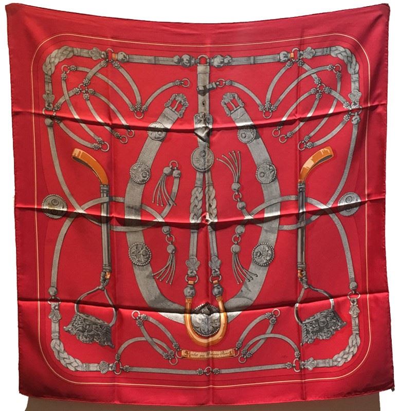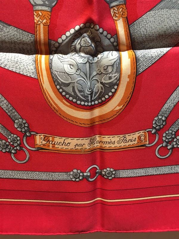 Beautiful Vintage Hermes red silk Gaucho scarf in very good condition. Original silk screen design c1978 by Caty Latham features various horse dressings and bridal hardware over a red background. 100% silk, hand rolled hem, made in france. original tag attached. No smells or fabric pulls. A few small stains/water marks in 3 discrete areas. please see photos for details. the biggest mark is about an inch long. All stains could probably be removed by a trusted dry cleaner but are currently not visible when worn. Measures 35"x35". Classic Hermes design perfect for men and women. #bags870