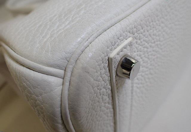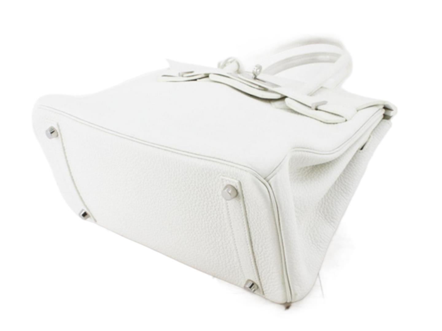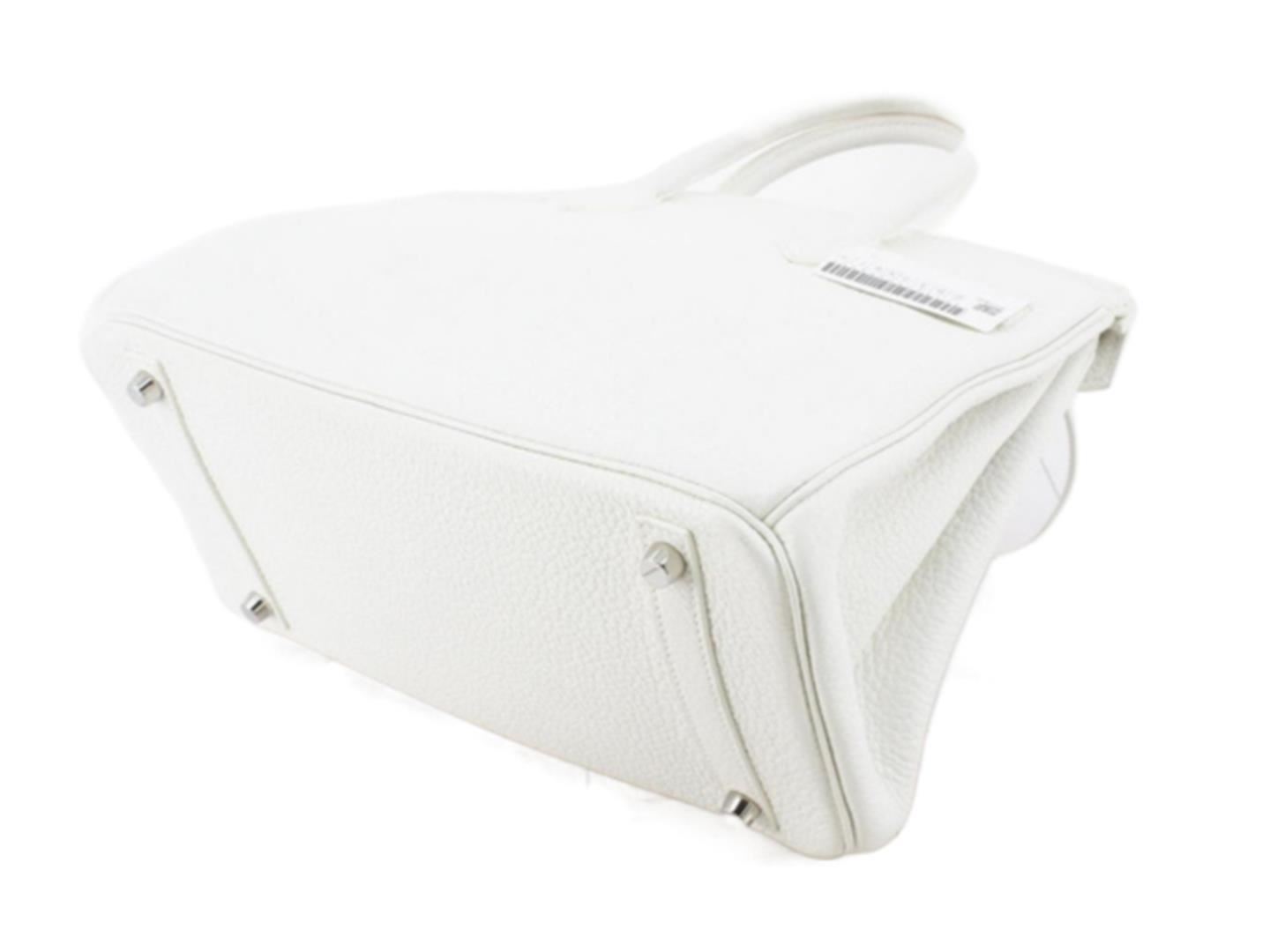 One Hermes White Clemence Birkin 30. Item is sold AS-IS. All available information is listed in the description and shown in the photo. Hermes White Clemence Birkin 30 with top handle, palladium plated, keys & clochette, interior zipper pocket, leather lining, turn lock closure.
