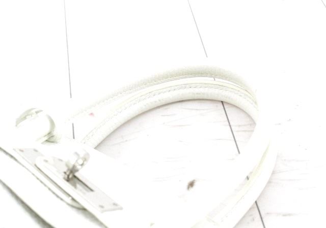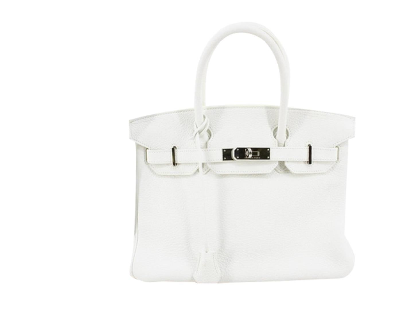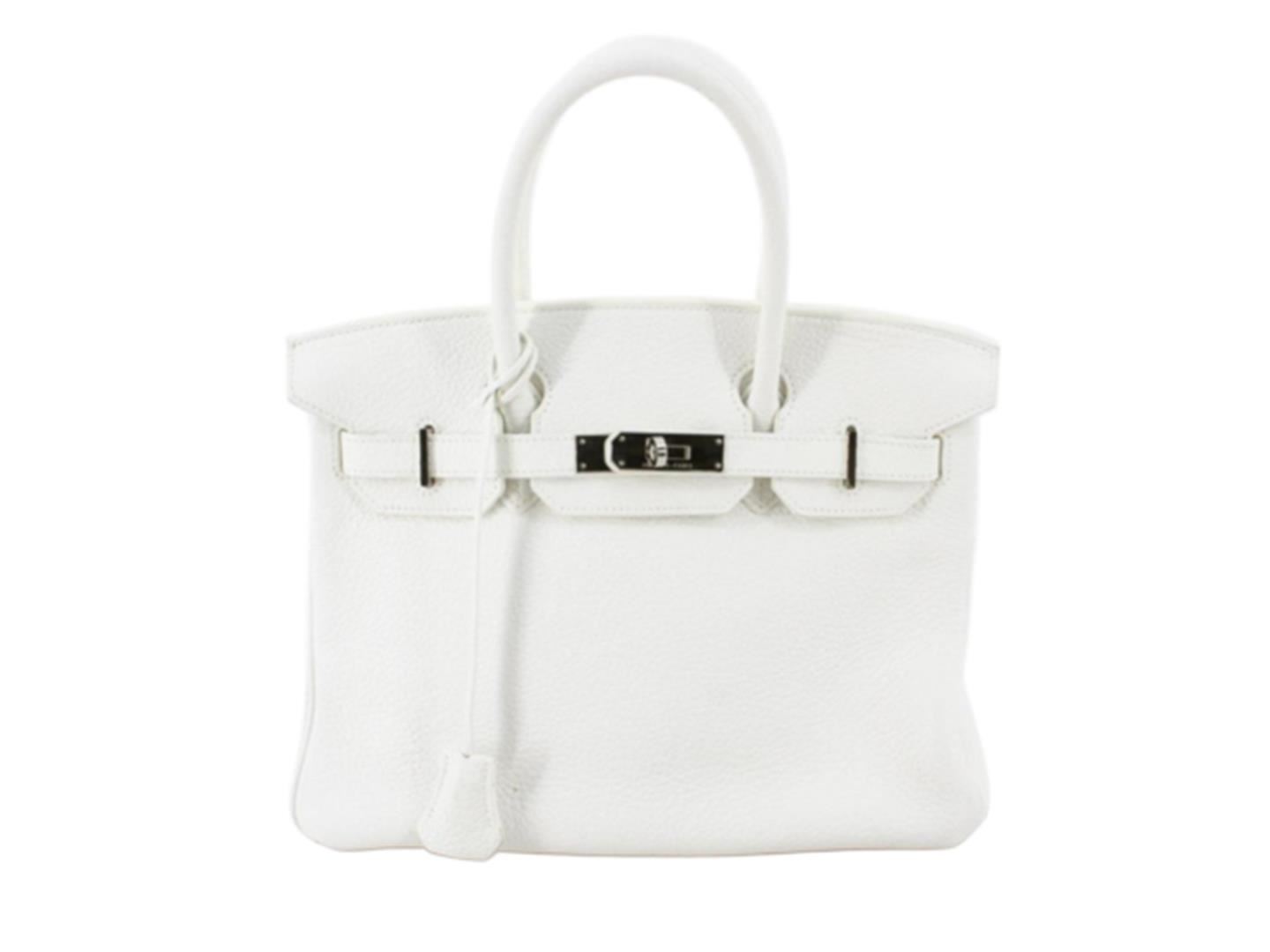 One Hermes White Clemence Birkin 30. Item is sold AS-IS. All available information is listed in the description and shown in the photo. Hermes White Clemence Birkin 30 with top handle, palladium plated, keys & clochette, interior zipper pocket, leather lining, turn lock closure.