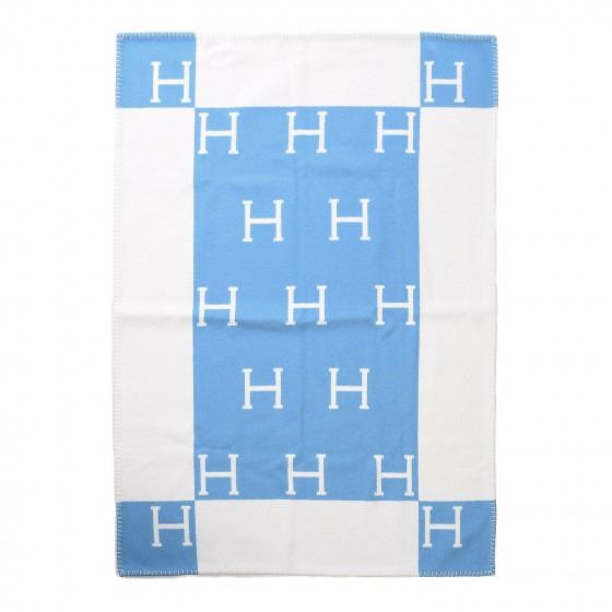 Bleu Genievre Blanc blanket is 90% wool and 10% cashmere. The blanket features blue and white with iconic Hermes H logos throughout and a stitched border.