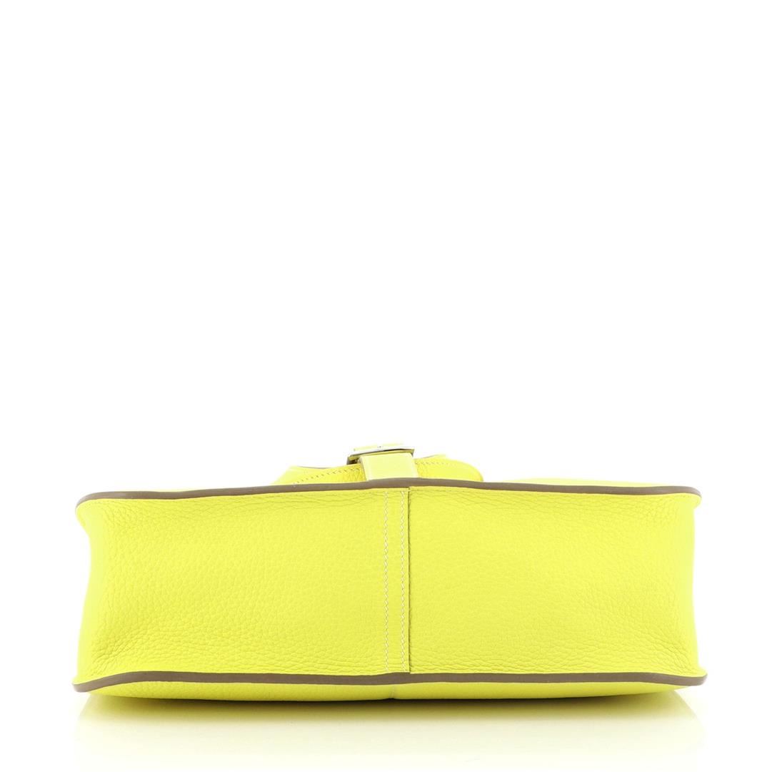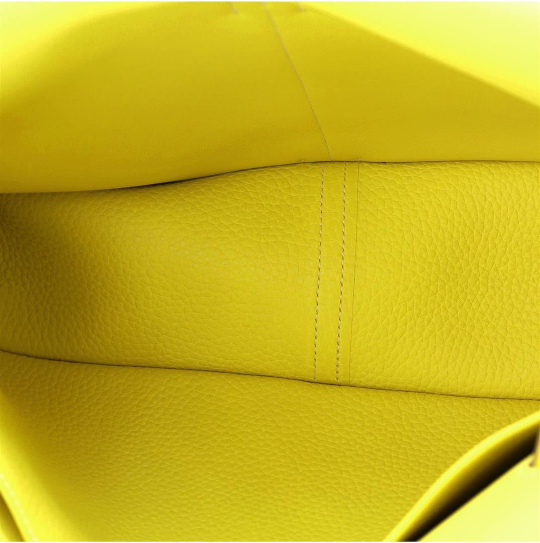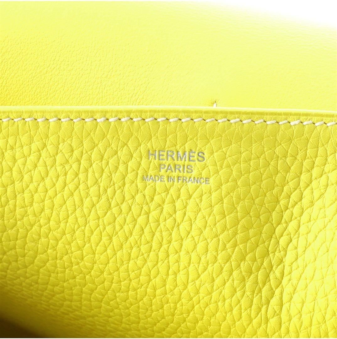Hermes Yellow Clemence Leather Halzan 31 Handbag features yellow calfskin, adjustable and removable leather shoulder strap, stirrup-shaped handles and palladium-plated hardware.