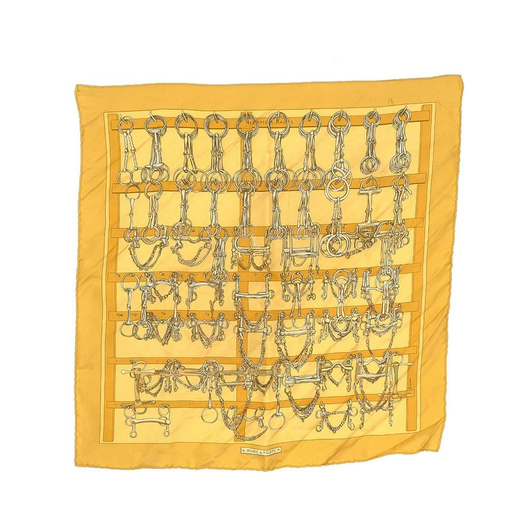 Hermes Yellow Mors et Filets Mini Silk Scarf with, Yellow Hermès 90cm silk scarf with Les Clèfs motif and hand-rolled edges. Measurements: Length: 35 in / 89 cm Width: 35 in / 89 cm 1 in / 3 cmCONDITION: Pre-Owned Good overall, please see photographs for detail.