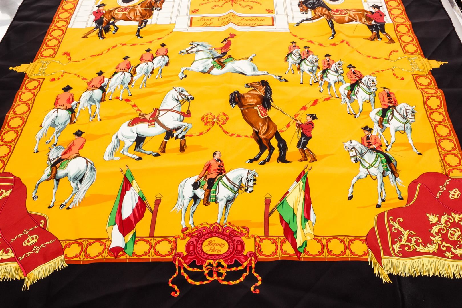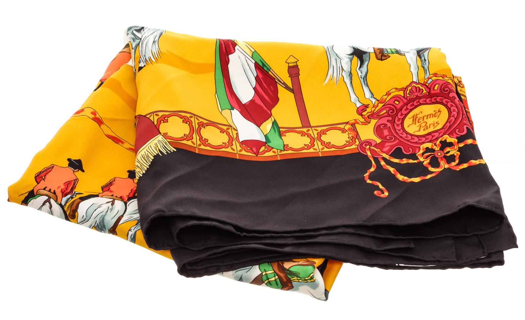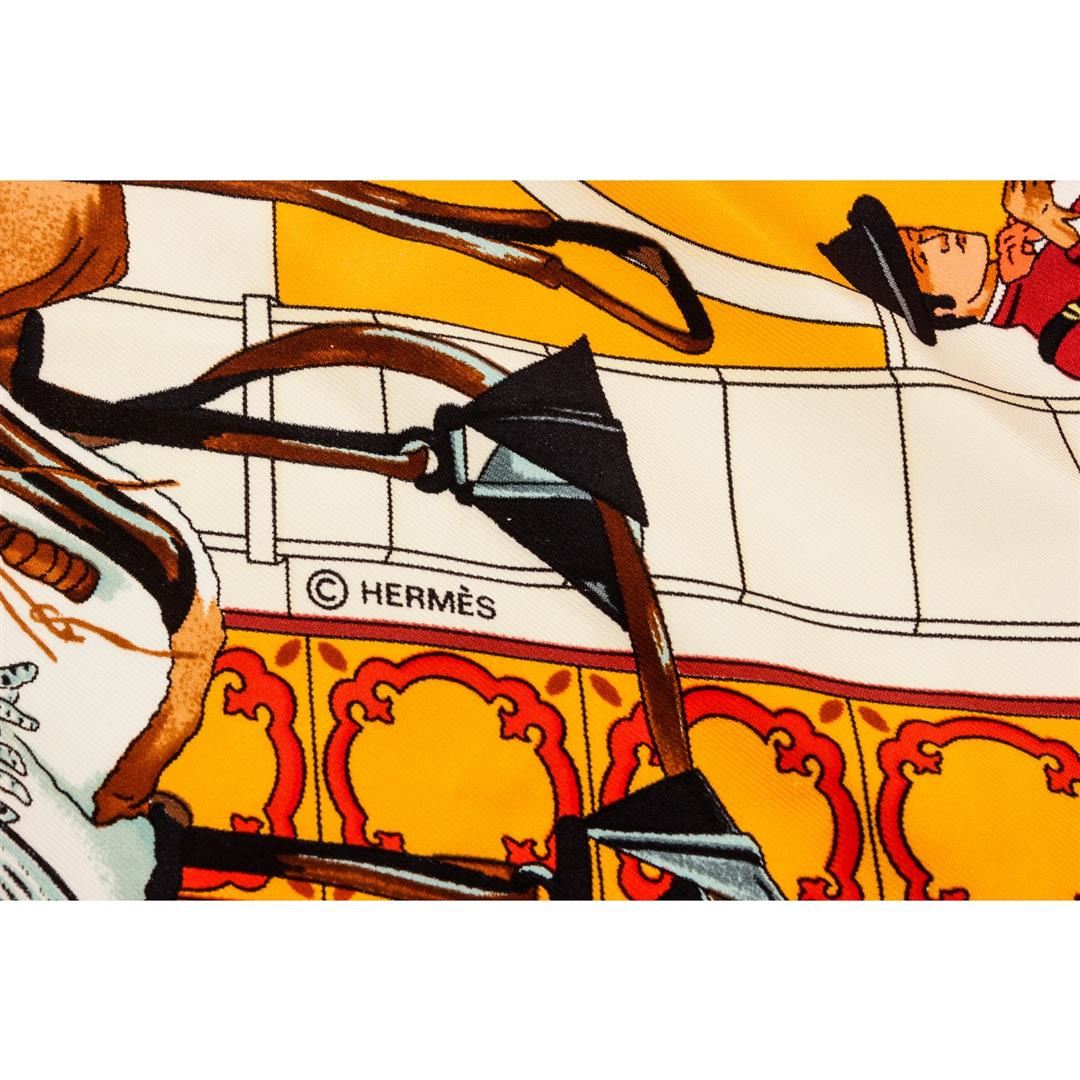 Hermes Yellow Black Multicolor Real Escuela Andaluza Hubert de Watrigant Equestrian Silk Scarf 90, hand rolled edges.