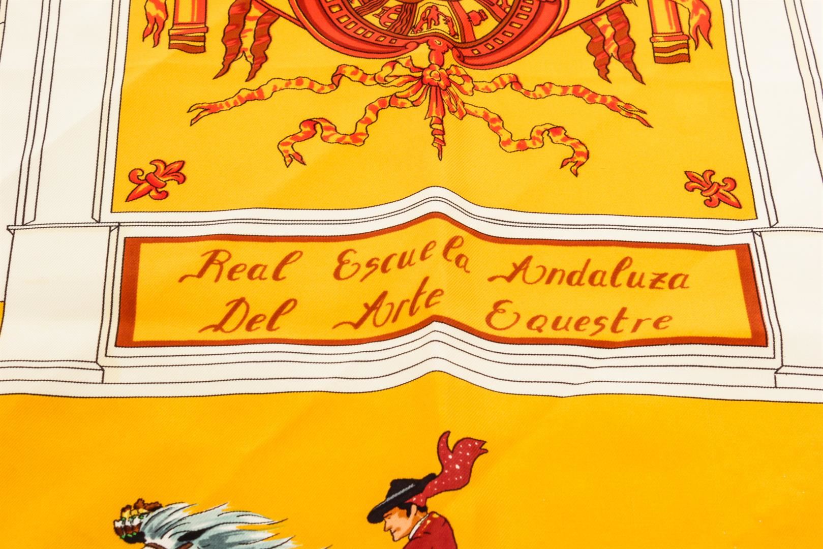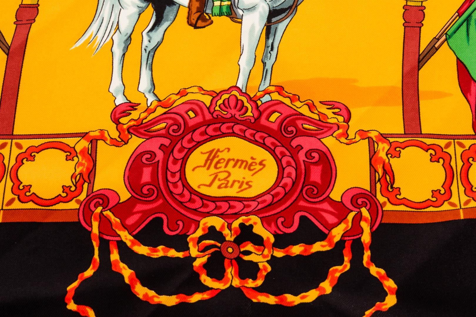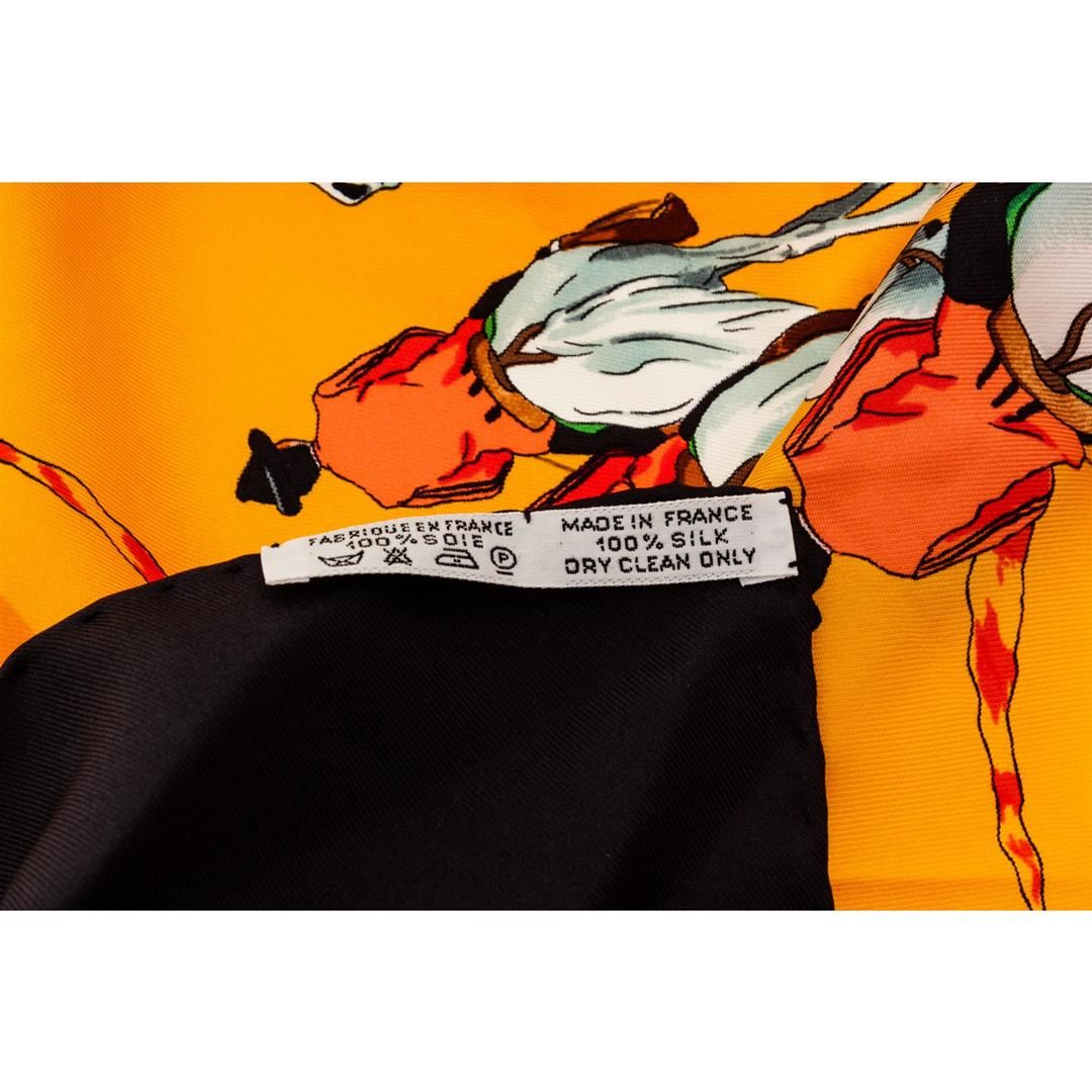 Hermes Yellow Black Multicolor Real Escuela Andaluza Hubert de Watrigant Equestrian Silk Scarf 90, hand rolled edges.