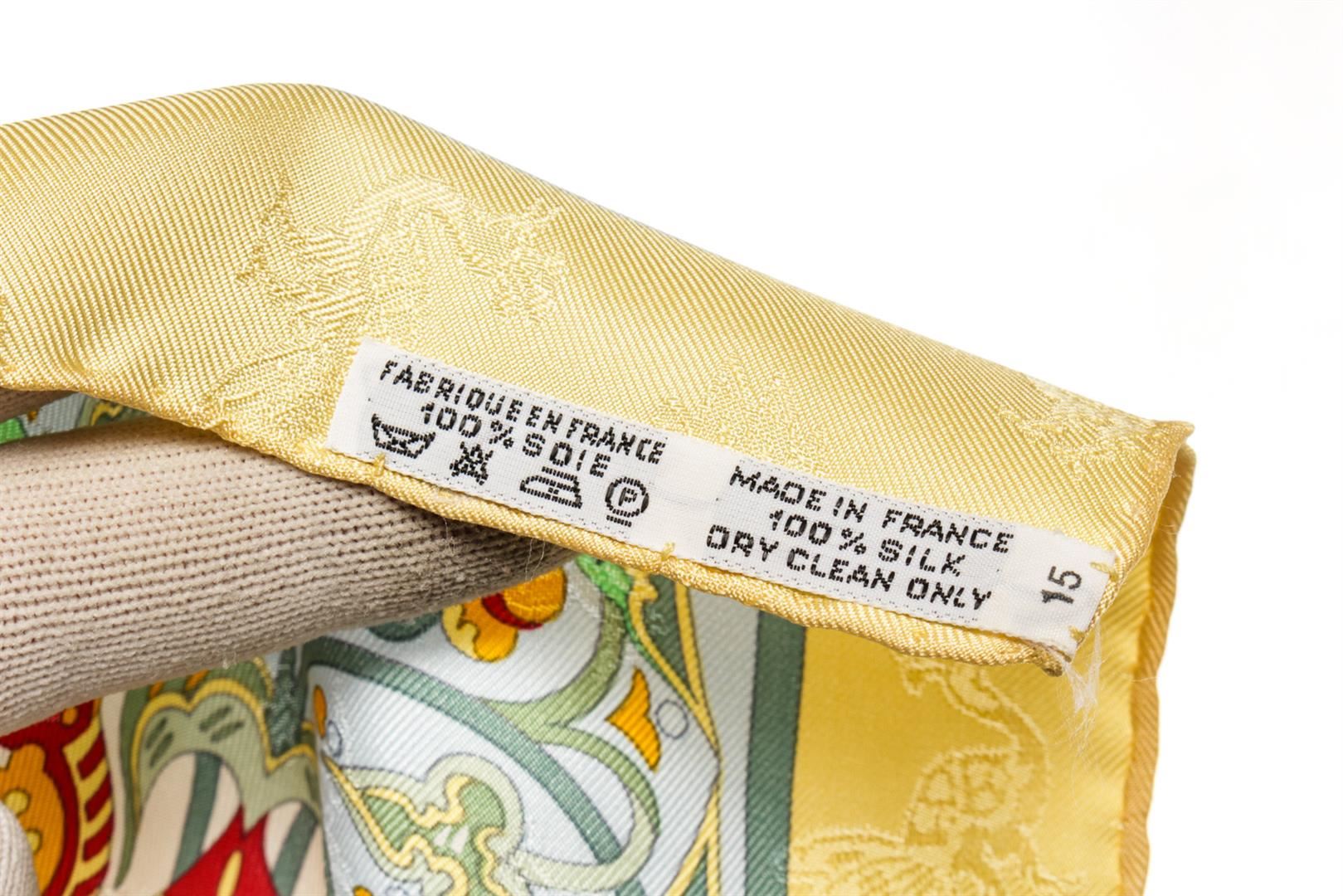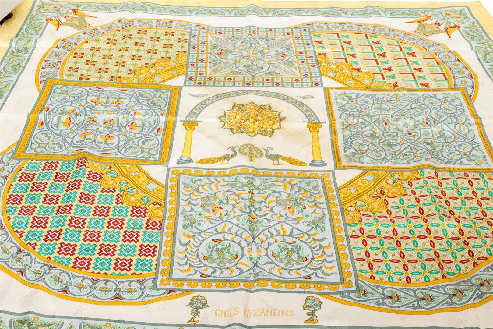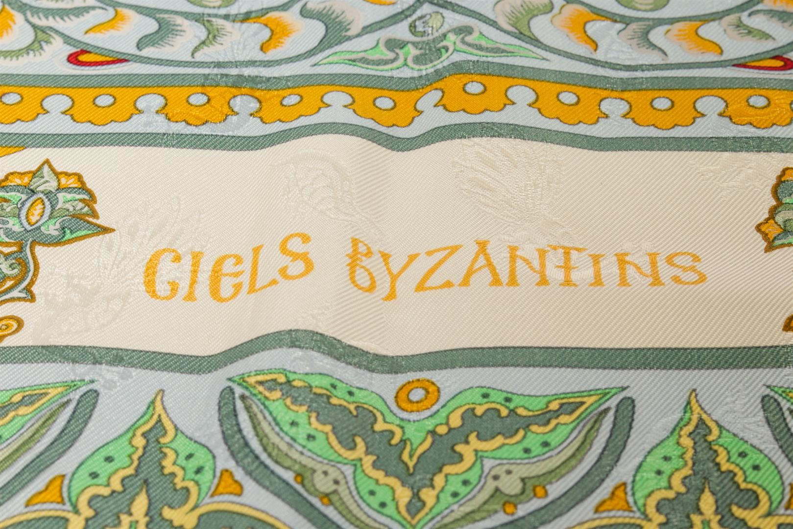 This Hermes scarf is made from 100% silk. It features a printed multicolor Ciels Byzantins pattern in off yellow cream blue and green. 35"x35"