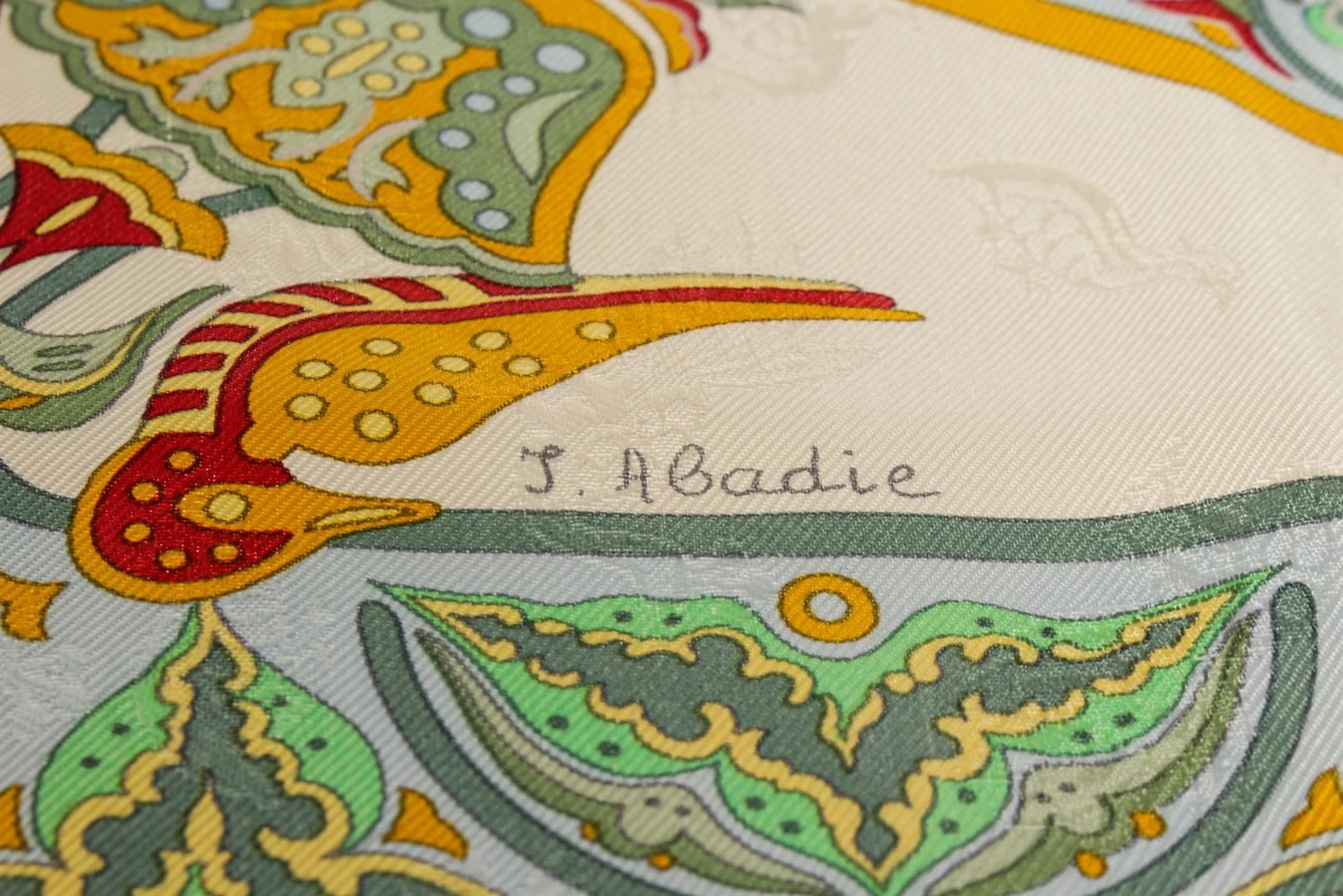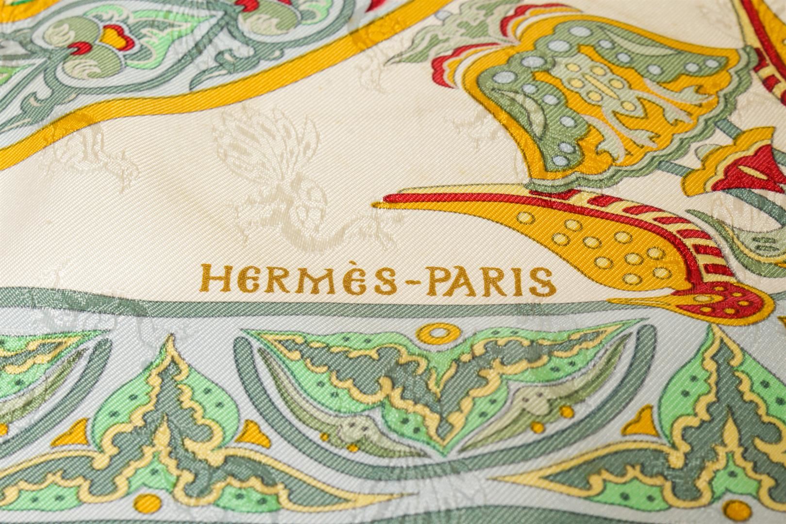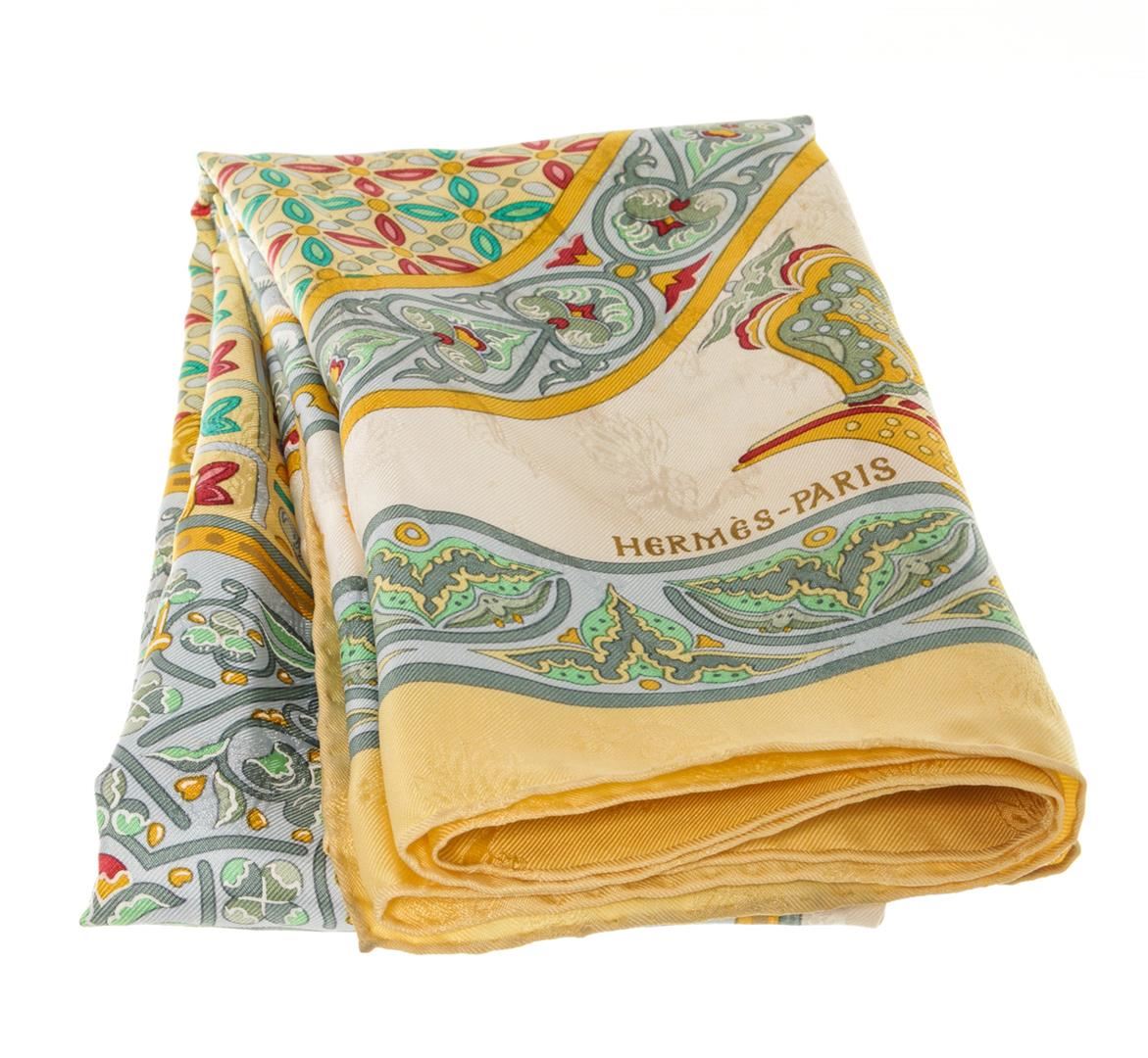 This Hermes scarf is made from 100% silk. It features a printed multicolor Ciels Byzantins pattern in off yellow cream blue and green. 35"x35"