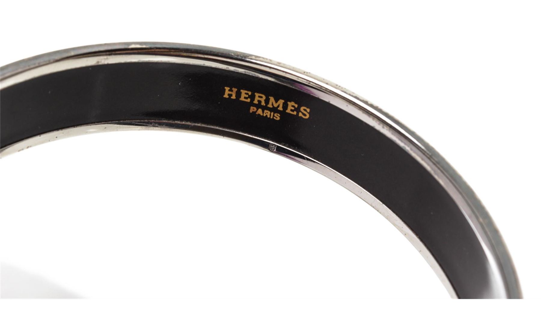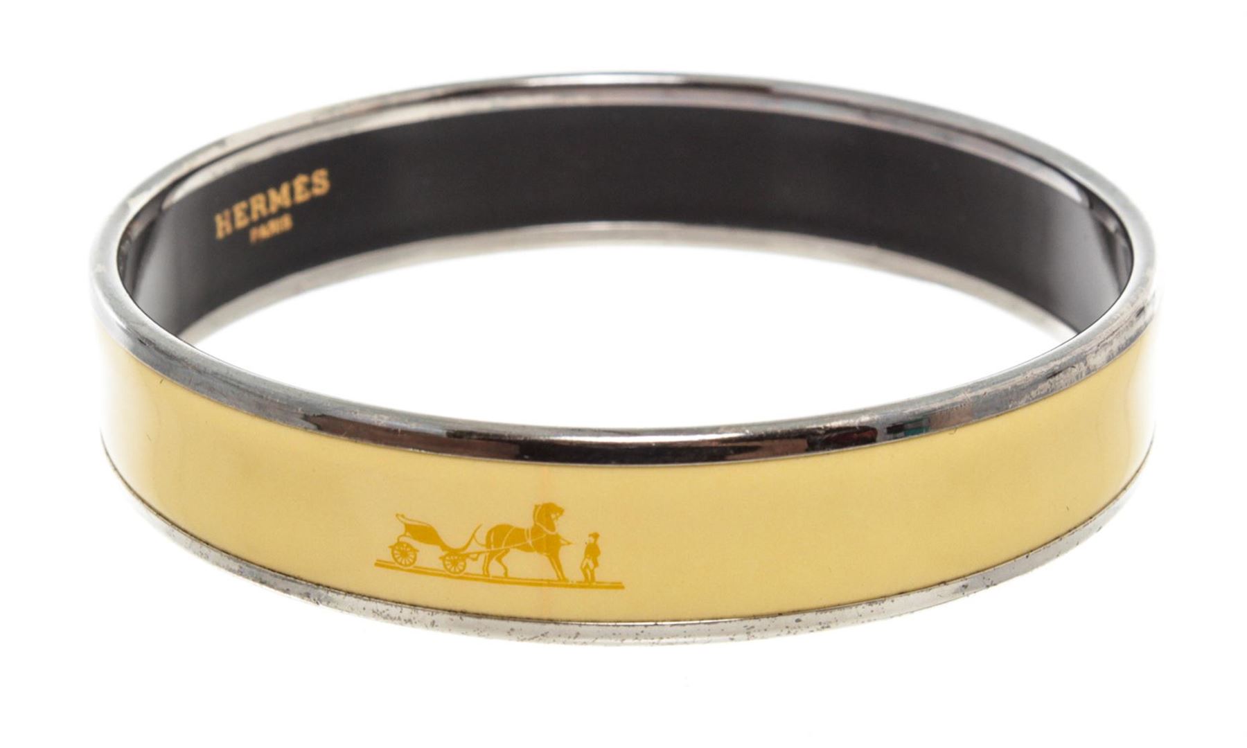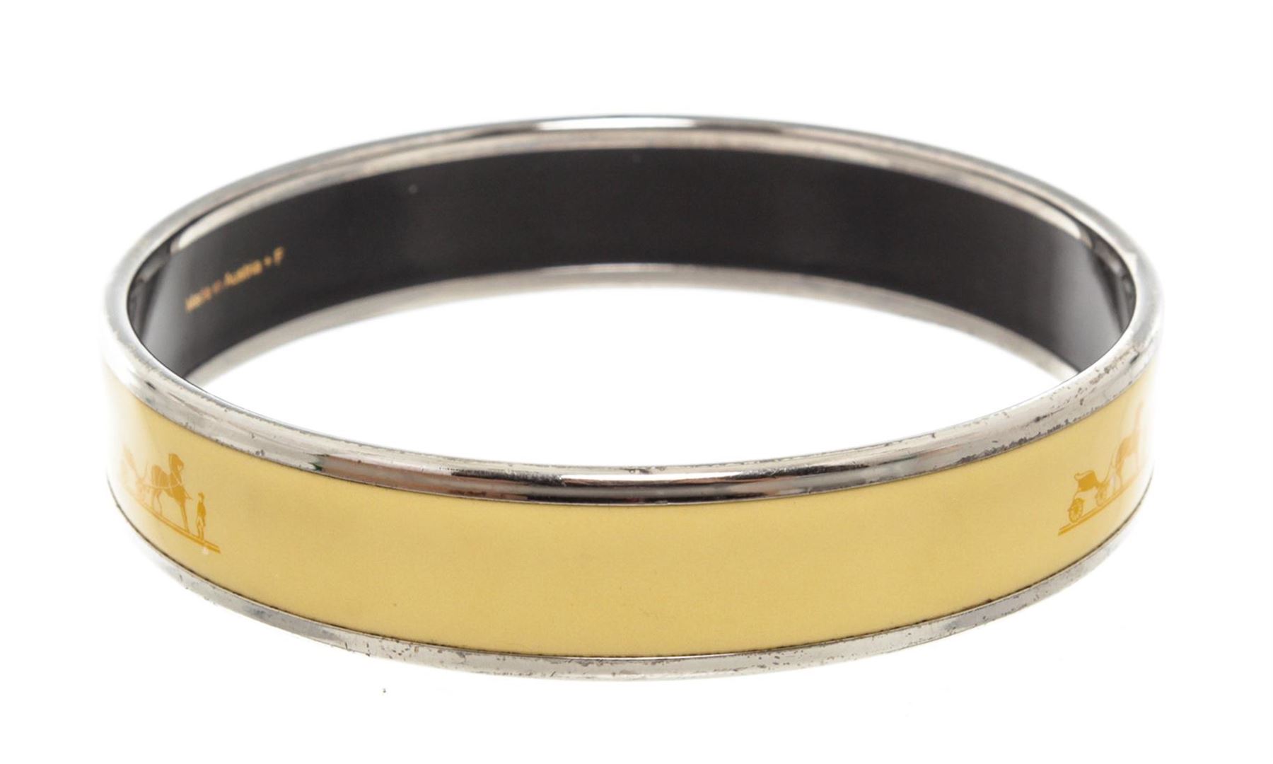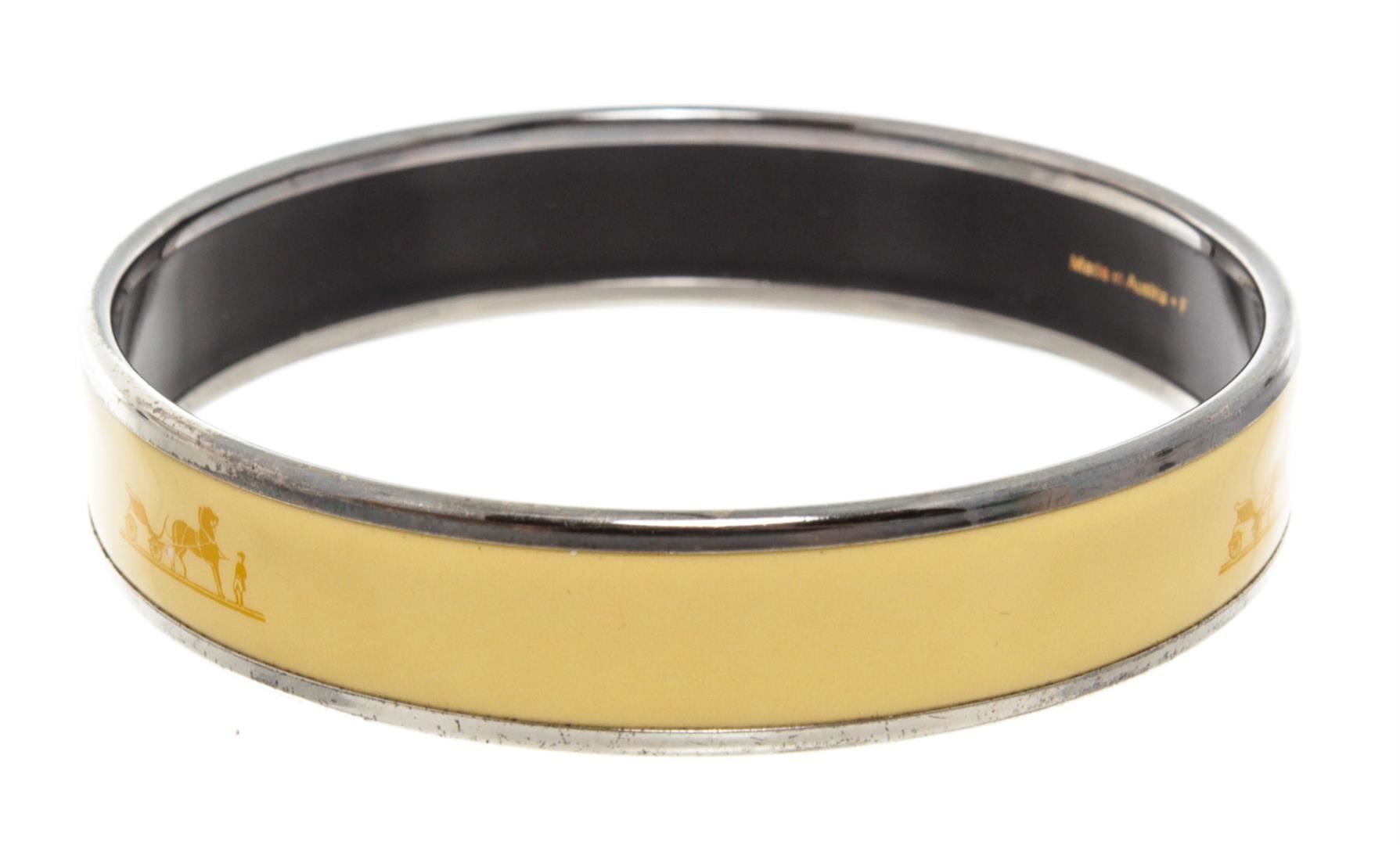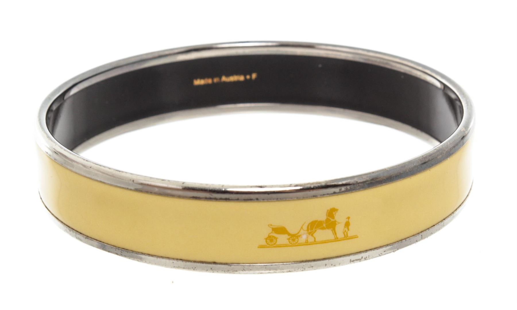 One Hermes Yellow Narrow Caleche Bangle Bracelet. Palladium-plated Hermès Calèche narrow bangle featuring printed Yellow enamel. Designer : MKX