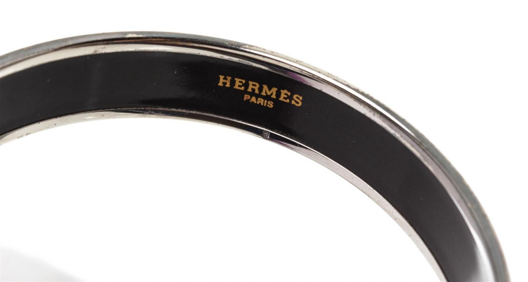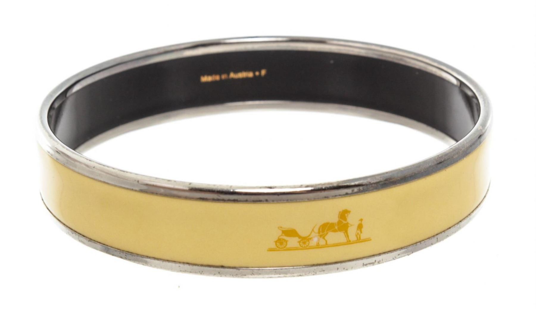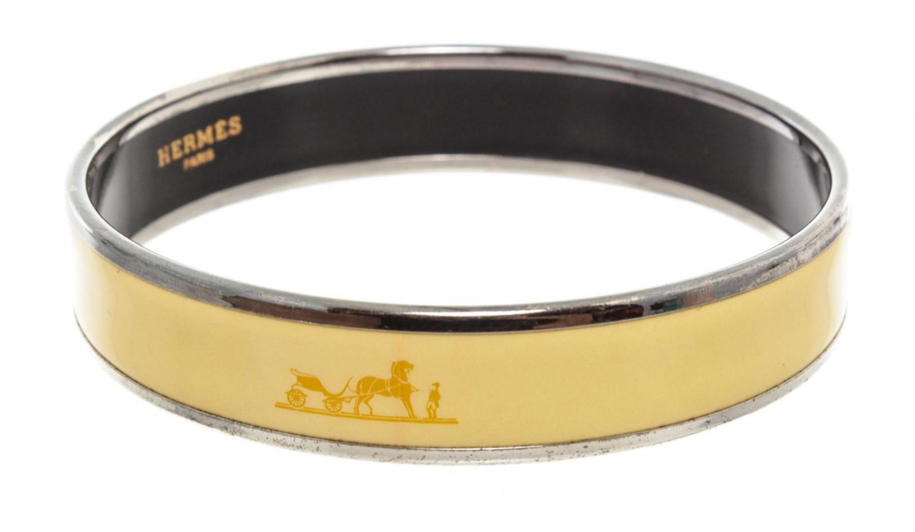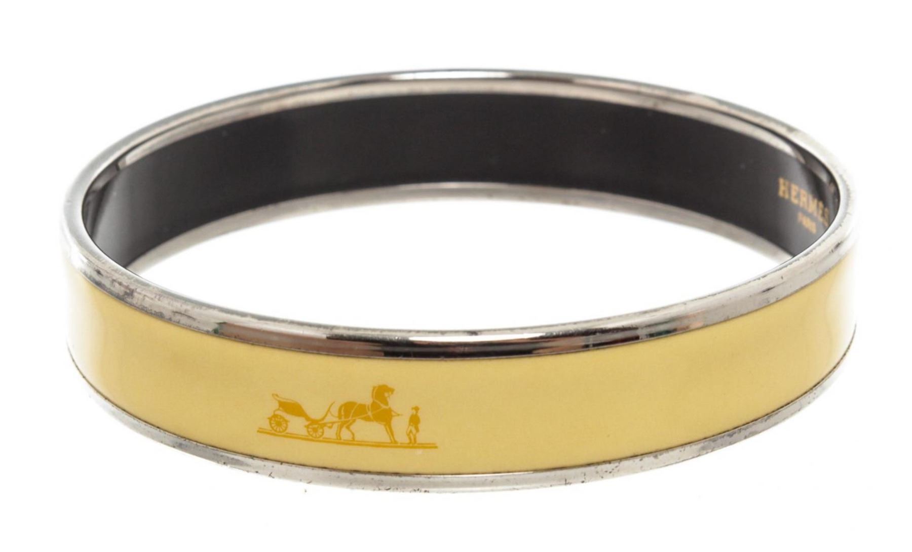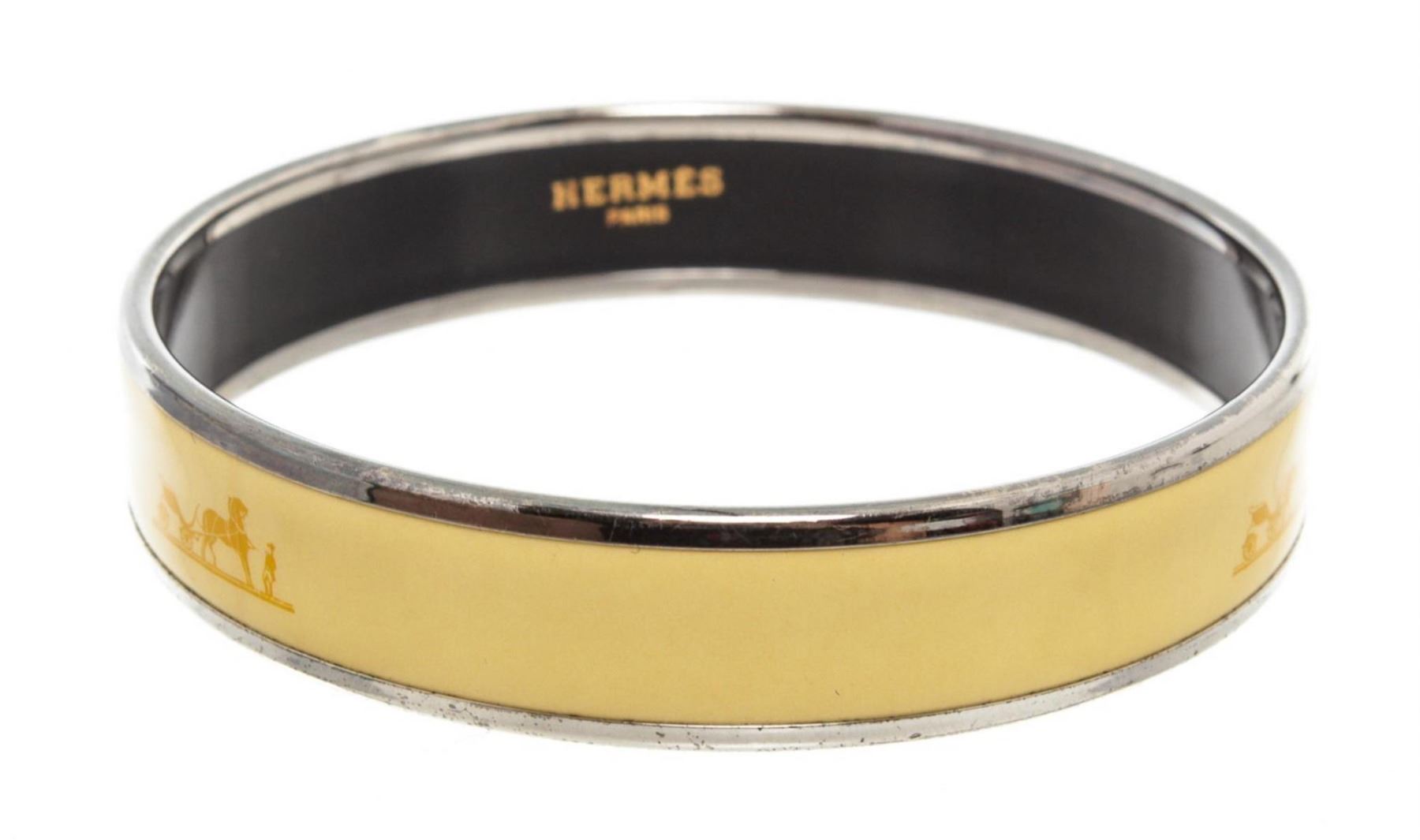 One Hermes Yellow Narrow Caleche Bangle Bracelet. Palladium-plated Hermès Calèche narrow bangle featuring printed Yellow enamel. Designer : MKX
