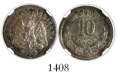 Hermosillo, Mexico, 10 centavos, 1882A, encapsulated NGC AU 58. KM-403.6. Rainbow toning over luster, die-crack to right of 10, crude rims (as made).
