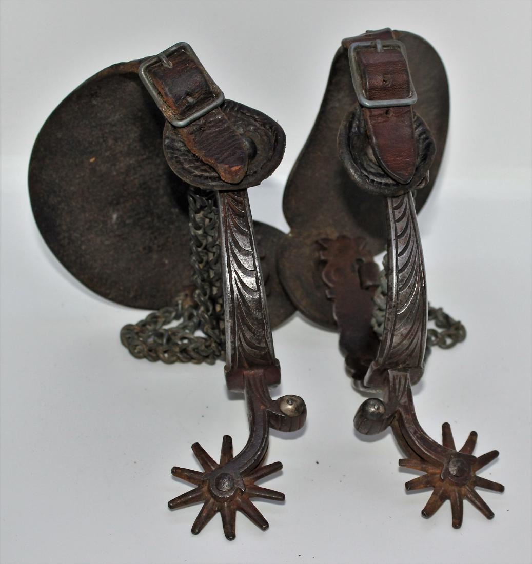 Handsome pair of early unmarked California style spurs, single mounted with finely engraved silver that appears to be Hernandez, with radical drop shanks, multi-point rowels and original straps.