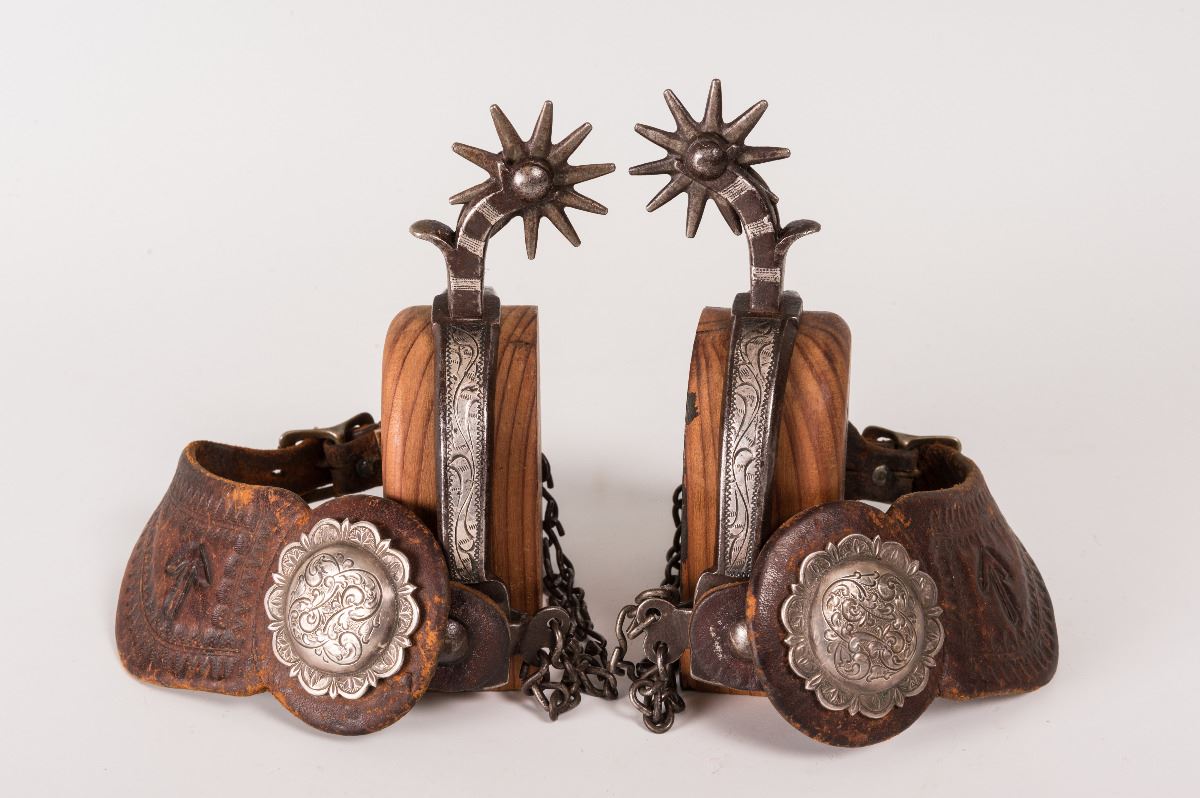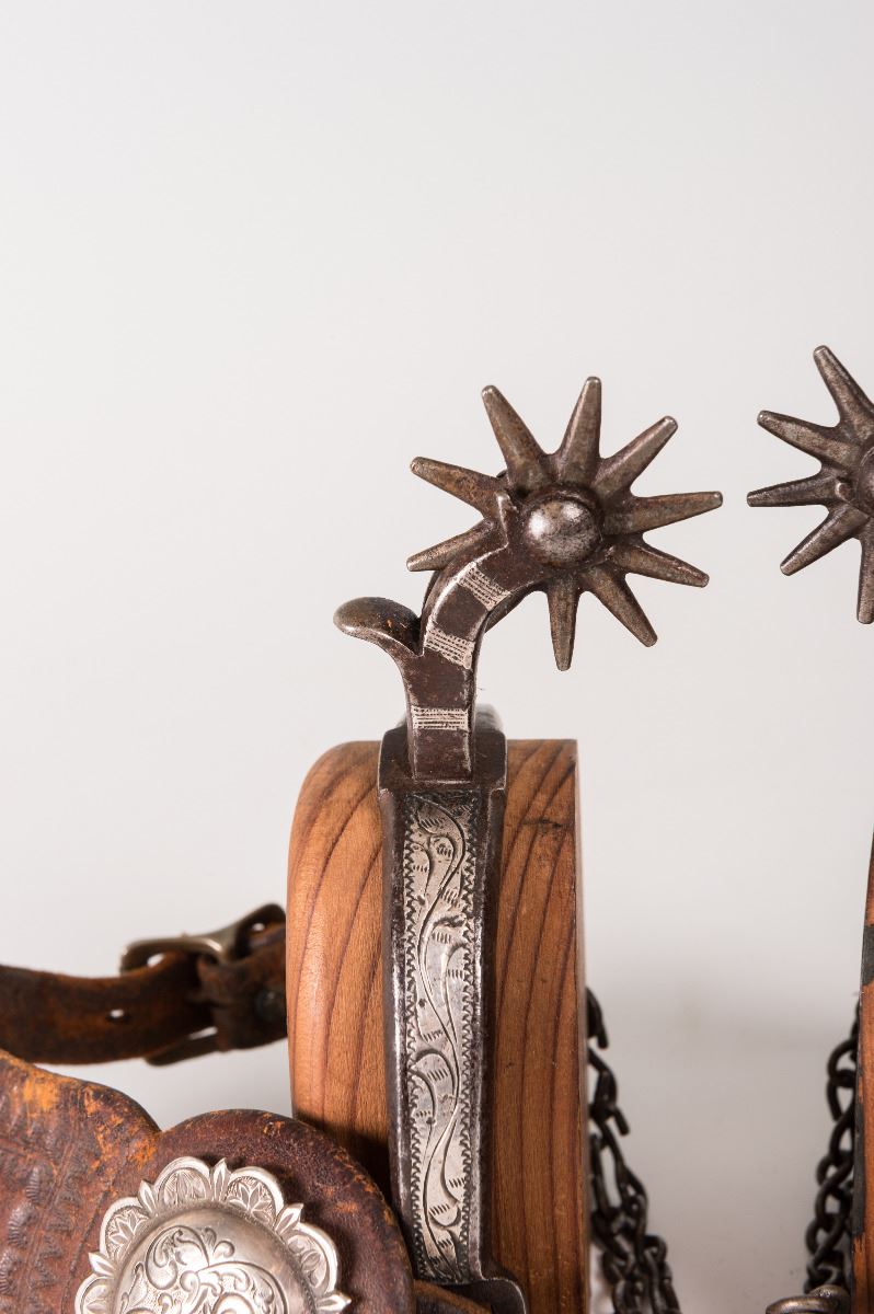 Hernandez Spurs. 1 ½", 10 point rowels. Unmarked, silver inlaid California style spurs fitted with heel chains and fine period straps with engraved conchos. Circa 1890-1920.