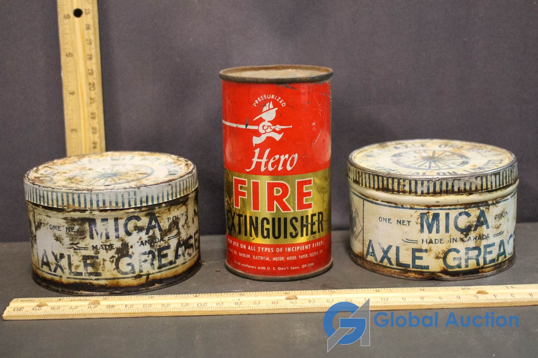 Hero Fire Extinguisher Can & (2) Mica Axle Grease Tins
