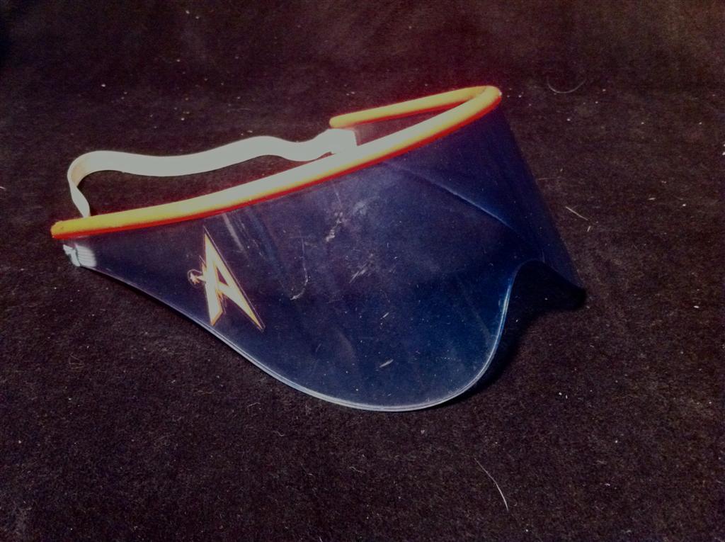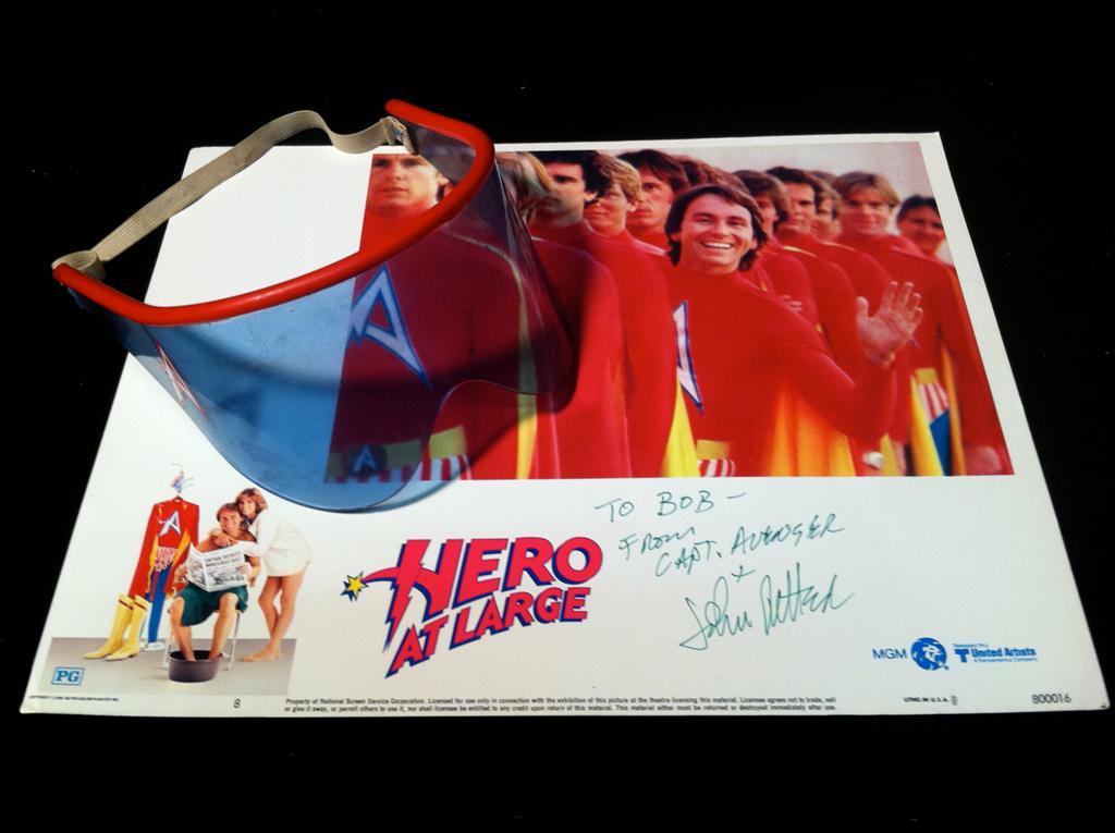 Hero at Large (1980) - An original screen worn visor used by John Ritter with "JR" written on strap. Also includes an autographed lobby card. Includes documentation. Visor: 7" x 6" x 4" Card: 11" x 13"