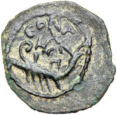 Herod Archelaus, 4 BCE - 6 CE. AE 2 Prutot (18.5 mm). Double cornucopiae, turned to right. Reverse: Galley to left. AJC plate 4, 3b; H. 503. Large flan. Choice Very Fine.