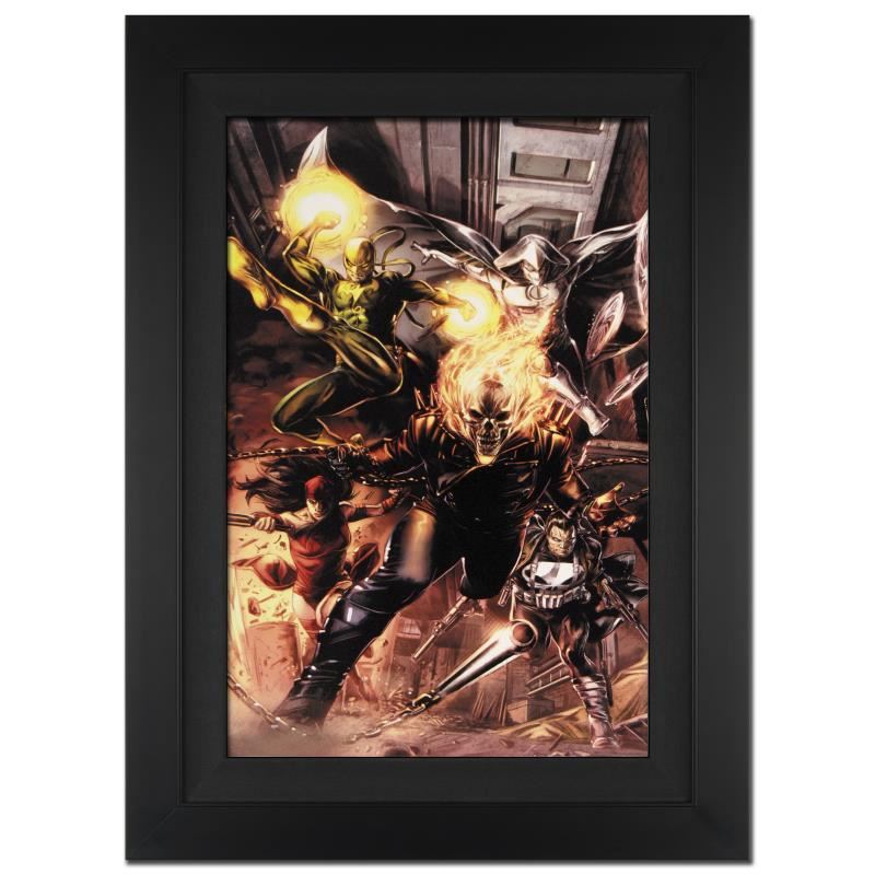 A piece of comic book history, this limited edition, from original art by Doug Braithwaite, depicts a mighty Ghost Rider. Doug Braithwaite started out working on British comics, like 2000 AD and A1, but is best known for his Marvel Comics work on the Earth X sequels, Universe X and Paradise X, as well as The Punisher Kills, the Marvel Universe, and Punisher: MAX. "Heroes For Hire #1" is an extremely limited edition giclee on canvas by Doug Braithwaite presented by Marvel Comics, hand signed by the great Stan Lee and numbered out of only 10! This piece comes custom framed and ready to hang. Includes Certificate of Authenticity! Measures approx. 25" x 34" (with frame), 18" x 27" (image).