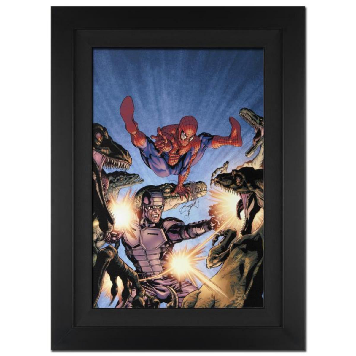 A piece of comic book history, this limited edition, from original art by David Yardin, depicts an action-packed Spider-Man scene. David Yardin has done cover art for such Marvel franchises as Iron Man and the X-Men. "Heroes For Hire #7" is an extremely limited edition giclee on canvas by David Yardin presented by Marvel Comics, hand signed by the Great Stan Lee (1922-2018) and numbered out of only 10! This piece is custom framed and ready to hang. Includes Certificate of Authenticity! Measure approx. 25" x 34" (with frame), 18" x 27" (image). Reference #: 203542.