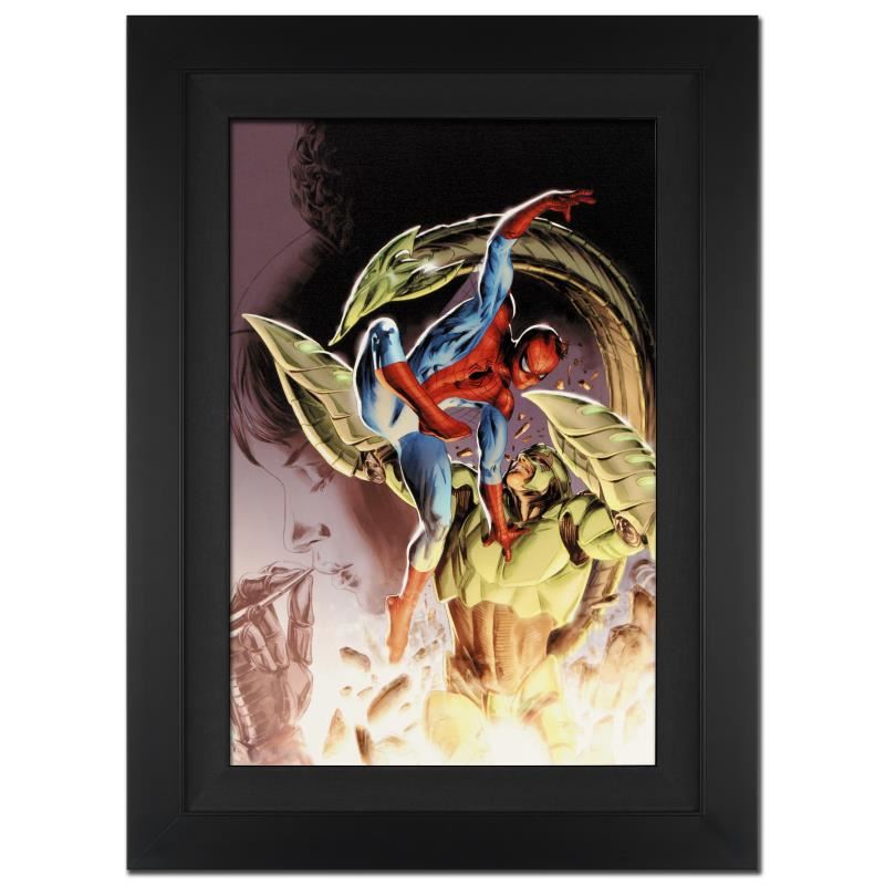 A piece of comic book history, this limited edition, from original art by Doug Braithwaite, depicts Spider-Man and Scorpion. Doug Braithwaite started out working on British comics, like 2000 AD and A1, but is best known for his Marvel Comics work on the Earth X sequels, Universe X and Paradise X, as well as The Punisher Kills, the Marvel Universe, and Punisher: MAX. "Heroes For Hire #8" is an extremely limited edition giclee on canvas by Doug Braithwaite presented by Marvel Comics, hand signed by the Great Stan Lee (1922-2018) and numbered out of only 10! This piece is custom framed and ready to hang. Includes Certificate of Authenticity! Measures approx. 25" x 34" (with frame); 18" x 27" (image).