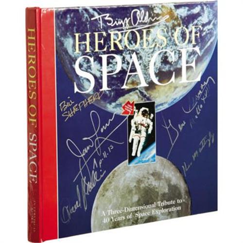 <B><I>Heroes of Space </B></I></B></I><B>Signed by Shepard, Cernan, Mattingly, Lovell and Aldrin.</B></I> (Santa Monica, CA; Intervisual Books; 1999.) This book pictures our space heroes on their missions in 3-D. The signatures of "<I>Buzz Aldrin</B></I>", "<I>Gene Cernan/ Apollo XVII</B></I>", "<I>Ken Mattingly</B></I>", "<I>Jim Lovell/ Apollo 13</B></I>", and "<I>Bill Shepherd</B></I>" appear on the front of the book in silver and gold sharpie. An unknown signature appears below Lovell's, but is not Collins. All of the pop-up presentations are intact and working.<BR><BR><b>Shipping:</b> Books & Catalogs (<a target="_blank" href="http://www.heritageauctions.com/common/shipping.php">view shipping information</a>)