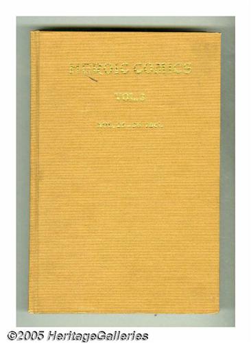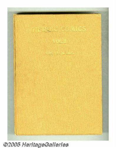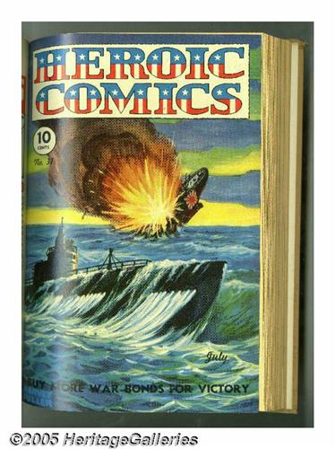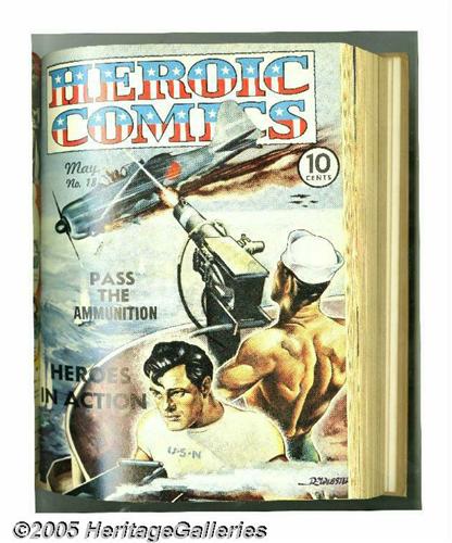 <B>Heroic Comics #13-36 Bound Volumes (Eastern Color, 1942-46).</B></I> Here's something unusual to turn up in the Random House collection of Western Publishing bound volumes. These two volumes of <B>Heroic Comics</B></I> were published by the Eastern Color Press; They may have been kept to check the competition! At any rate, here's some great World War II-era comics that feature a mixed bag of contents, including oddball superheroes (Hydroman, Rainbow Boy, Man o' Metal, Music Master); strip reprints ("Reg'lar Fellers", "Flyin' Jenny"); and stories about America's soldiers and men of war. Later issues in this group feature art by a young Alexander Toth. All comics were file copies that were bound and trimmed into hardback books for office reference use; many still retain their like-new appearance. Overstreet 2005 VG 4.0 value = $888. <I>From the Random House Archives.</B></I>