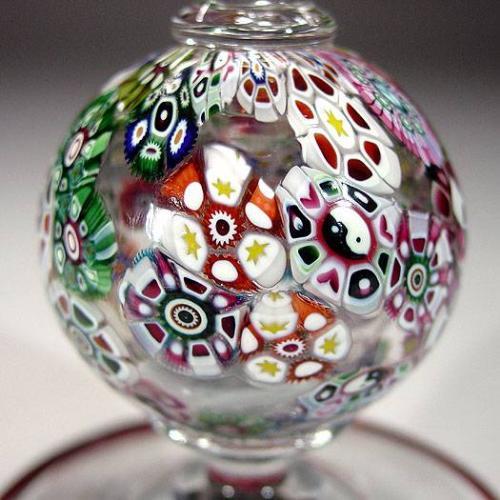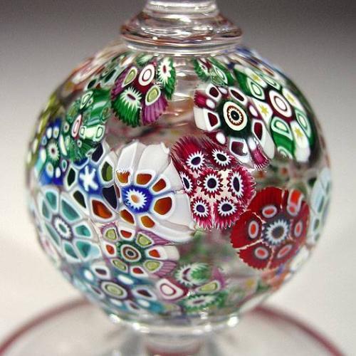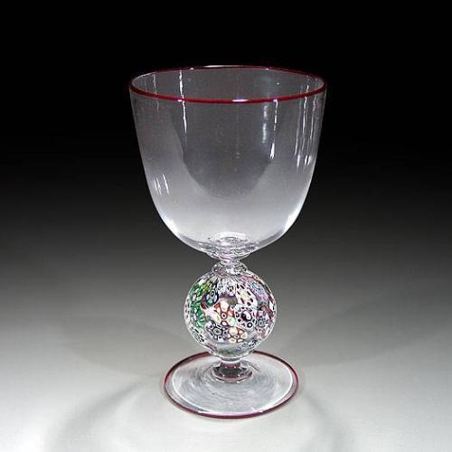 Heron Glass 2002 "Murrine Ball Goblet", a large glass goblet, with assorted complex canes scattered on a round center section, between the clear cup and the circular base; ring of ruby on the lip and on the outer edge of the base. Signed/dated. Height 6 1/2".