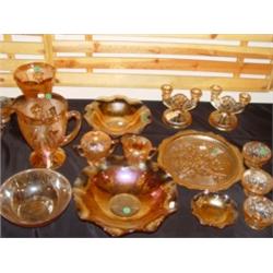 Herring Bone Iris Pattern Carnival Glass Pitcher, vase, platter, (2) candle holders, 3 serving bowls, cream/sugar, 4 small pieces