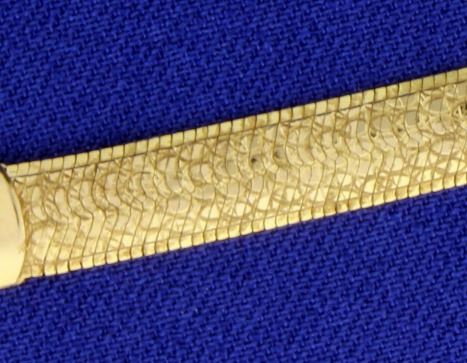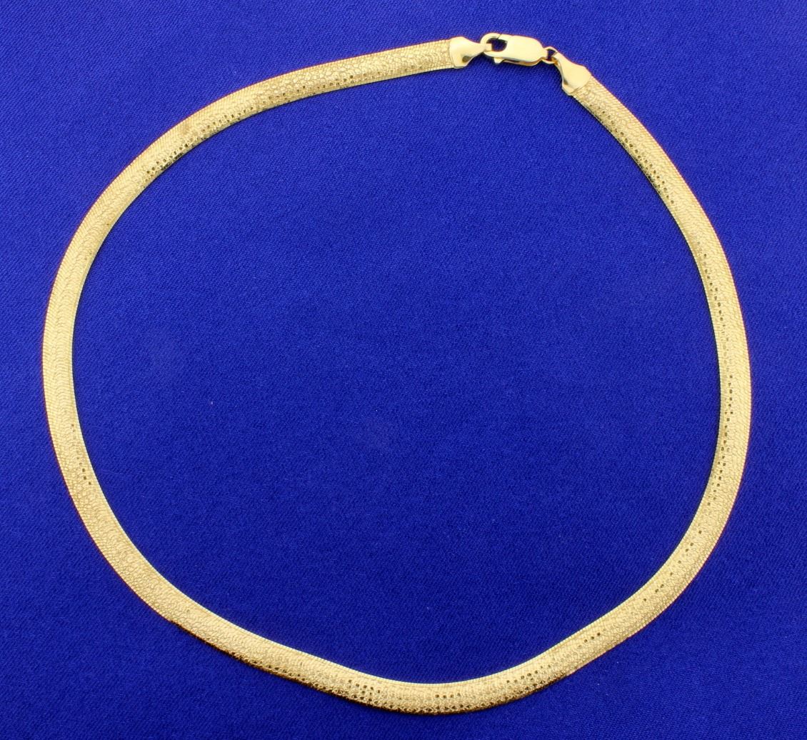In 14k yellow gold this Italian made necklace is 16 inches long by 5.8mm wide. Unique nugget like pattern design. With a lobster clasp 13g