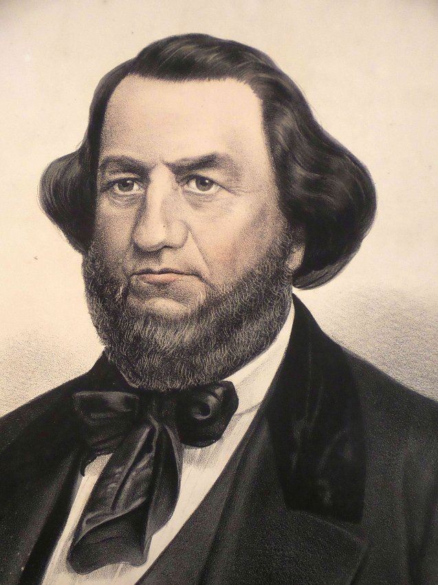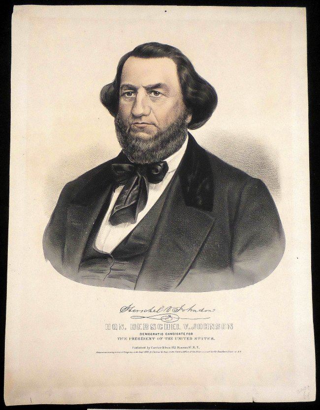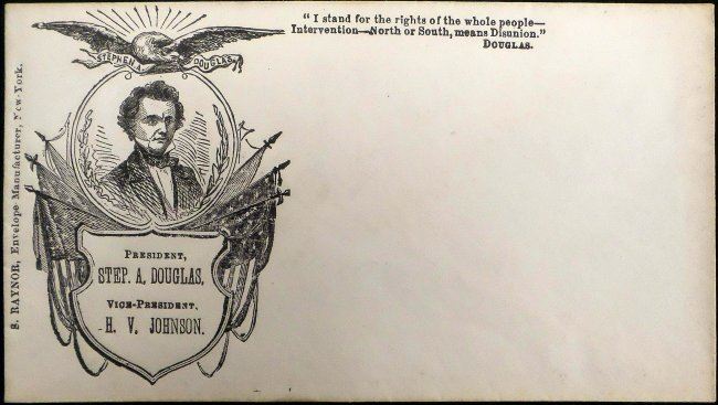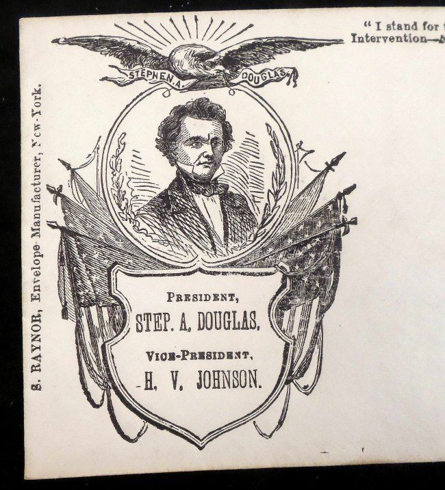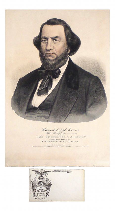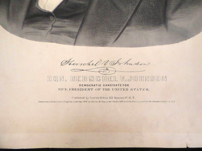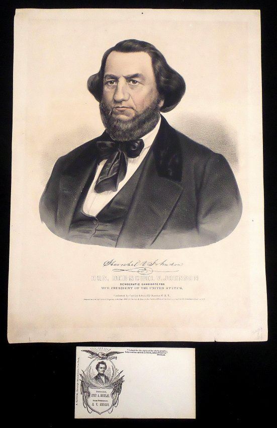 Comprises 1.) Lithograph titled "Hon. Herschel V. Johnson / Democratic Candidate for / Vice President of the United States," published by Currier & Ives,New York, N.Y., 1860. Depicts Johnson in a bust-length, 3/4 profile, pose above his facsimile signature. [Sheet: 16" H x 12" W]. Age-toning, minor staining, and margin wear with few tears. 2). Douglas and Johnson envelope bearing imprinted inscription "'I stand for the right of the whole people - Intervention - North or South, means Disunion' Douglas". Featuring a vignette portrait of Stephen Douglas enclosed within an oval surmounted by an eagle and flanked by American flags [3 1/8" H x 5 1/2" W]. Light soiling.