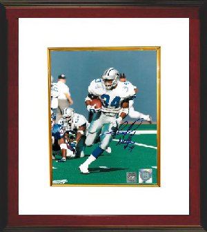 In 12 NFL seasons, Walker gained 8,225 rushing yards, 4,859 receiving yards, and 5,084 kickoff-return yards. This gave him 18,168 total combined net yards, ranking him second among the NFL's all-time leaders in total yardage at the time of his retirement. Walker is the only player to have 10,000+ yards from scrimmage and 5,000+ return yards (all of which were on kickoff returns). He is the only player to gain 4,000 yards three different ways: rushing, receiving, and kickoff returns. Another NFL record he possesses is that he is the only player with a 90+ yard reception, 90+ yard run, and a 90+ yard kickoff return all in the same season (1994). Herschel has hand signed this Dallas Cowboys 8x10 Photo. Custom White Mat and Premium Wood Framed as shown. NSD Hologram and Certificate of Authenticity from Athlon Sports.