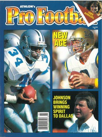 This is an Athlon Sports 1989 Pro Football Magazine with Dallas Cowboys Herschel Walker, Troy Aikman, and Jimmie Johnson on the cover. This Preview has team analysis, predictions, lineups, rosters and more for the 1989 Season