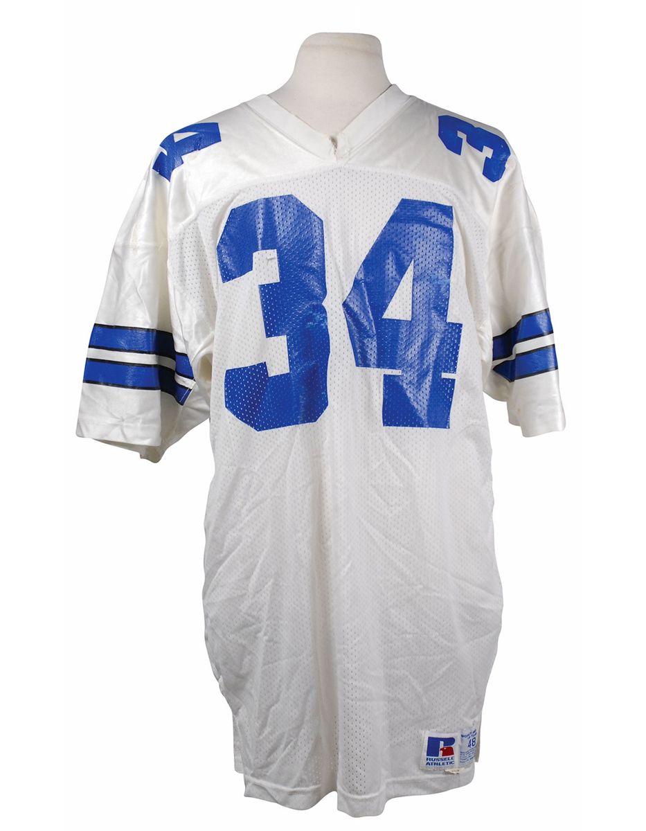Game-used official white mesh Russell Athletic Dallas Cowboys home jersey circa 1989, featuring "Walker" screened in block letters across rear nameplate and his number 34 screened in blue to chest, back, and shoulders. The Russell Athletic tag is sewn to the bottom left and indicates a size 48. Exhibits general marks, wear, and numerous team repairs consistent with use. Accompanied by a letter of provenance from Grey Flannel Auctions, 2008.