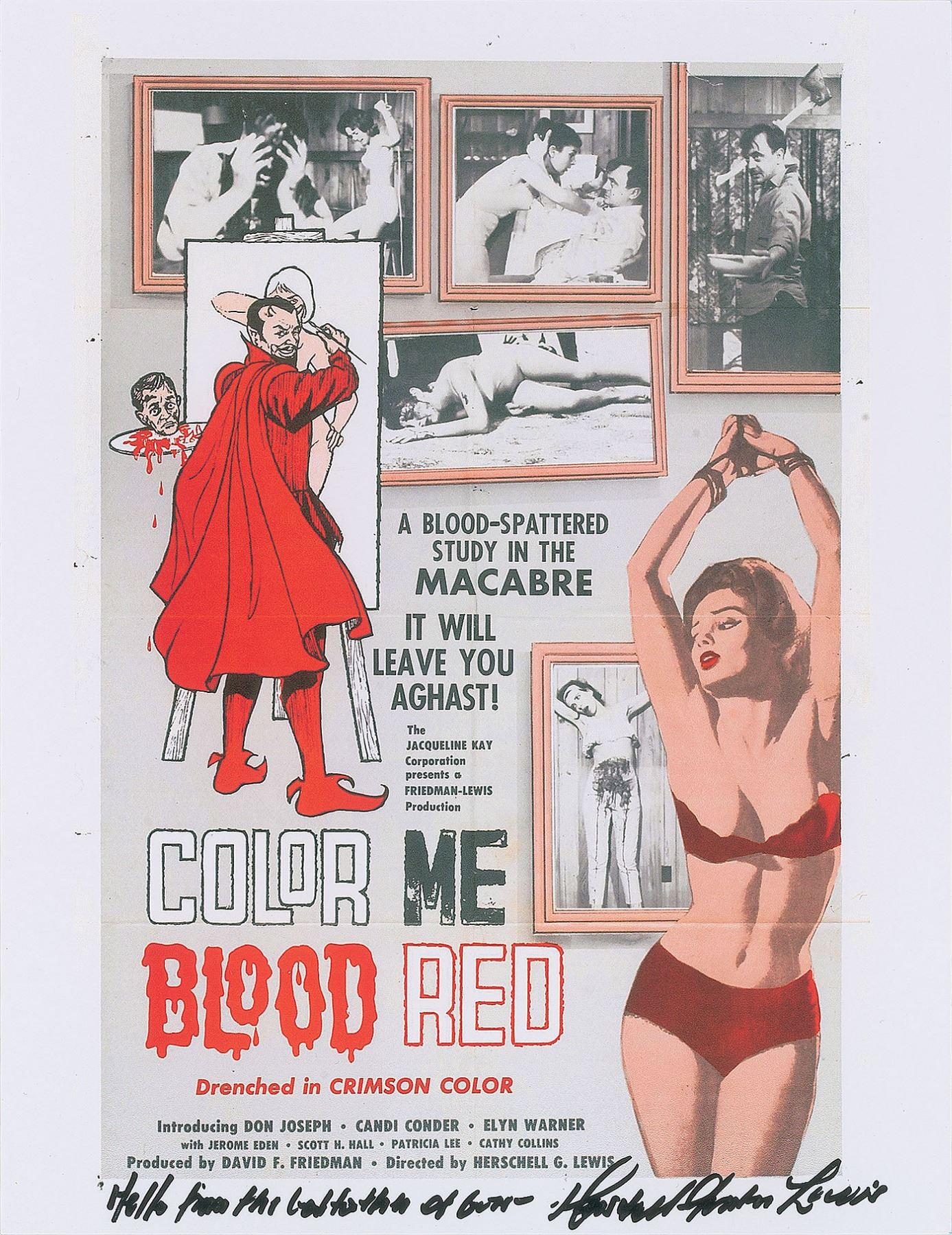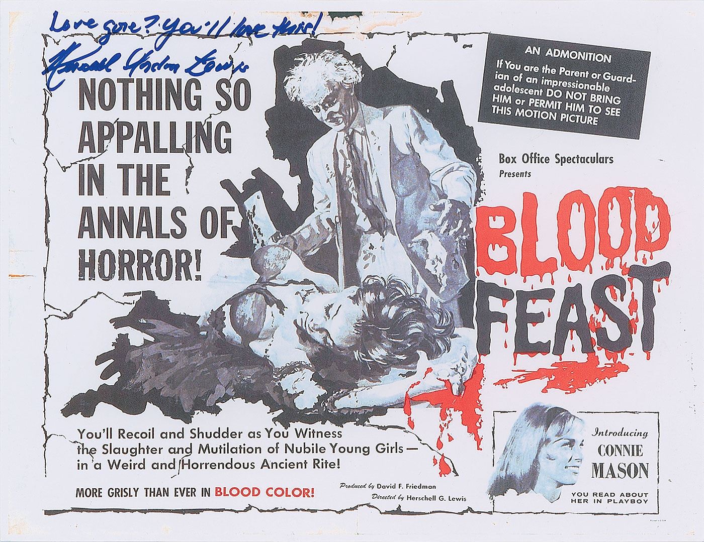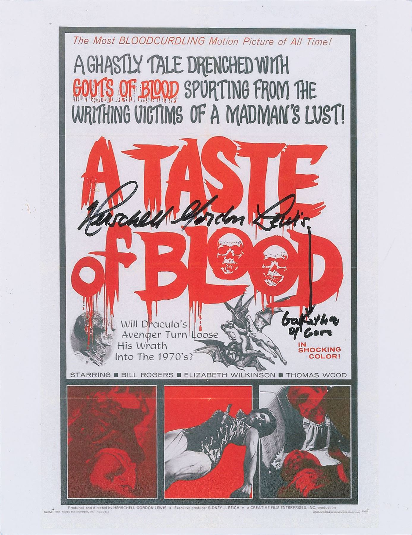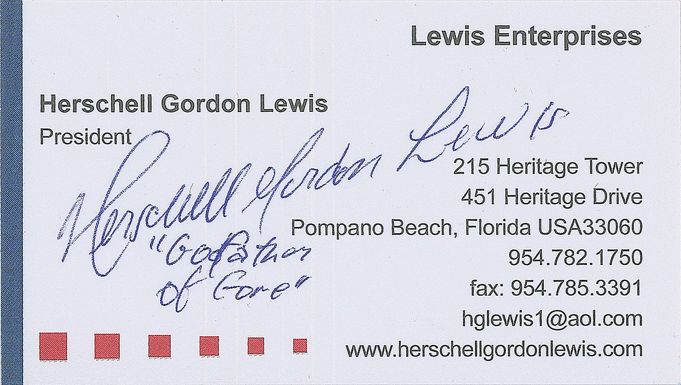 American filmmaker (1926–2016) who is best known for creating the 'splatter' subgenre of horror films. Four items: a Lewis Enterprises business card belonging to Herschell Gordon Lewis, 3.5 x 2, signed in blue ballpoint, "Herschell Gordon Lewis, 'Godfather of Gore'"; a color 11 x 8.5 laserprint photo of the poster for the 1963 film Blood Feast, signed in blue felt tip, "Love gore? You'll love this! Herschell Gordon Lewis"; a color 8.5 x 11 laserprint photo of the poster for the 1965 film Color Me Blood Red, signed in black felt tip, "Hello from the Godfather of Gore—Herschell Gordon Lewis"; and a color 8.5 x 11 laserprint photo of the poster for the 1967 film A Taste of Blood, signed in black felt tip, "Herschell Gordon Lewis, Godfather of Gore." In overall very fine condition.