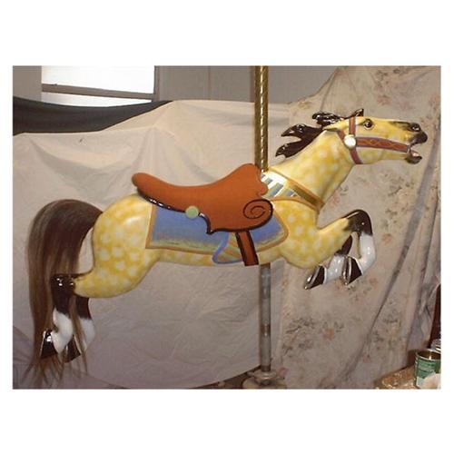 This very animated Herschell-Spillman middle Row jumper, is all wood. <p>This Carousel Horse is call a jumper, off a Traveling machine. <p>This carving is circa 1920-30.<p>He has been fully restored, (we will give his new owners the baby photos to see his progress).<p>Now he is in my studio .. his colors of the body area rich dapple palomino gold, with white socks and black stockings and black points (ears and muzzel) making him a Buckskin. <p>The Trappings are a rich redbrown saddle with black trim. The saddle blanket is shaded from blue to blue green to green. Bordered in Tan. I have painted an Indian motif pattern on the blanket and bridle.<p>This horse measures 36 inches tall, and 58 inches long. He wil come with the Brass poles and base set, which will finish at about 5 feet in height. On a shorter pole he is a Good size for a plant shelf. <p>He has a real Horse Hair Tail( reins and stirrups are additional) if you like. <p>All four original Metal Horseshoes are on his feet. <p> He has wood eyes and no jewels.<p>He has a scroll pattern on his saddle blanket, and a breastplate.<p>We have come complete with base and pole sets, with brass to go with you horse for $295.and up.<p> You might have ridden him!<p>We guarantee our horses. They come with a certificate of authenticity and history. I am a professional carousel artist and restorer for over 19 years.