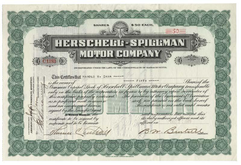 1919, Massachusetts. Stock certificate for 50 shares. Green/Black. Founded by Allan Herschell and Edward Spillman, the company was located in North Tonawanda, New York. It is, perhaps, best known for its production of a proprietory engine design sold to many different automobile manufacturers. In addition to building its own automobile models, the company was an important maker of merry-go-rounds, with the last one being built in the early 1960’s. Uncancelled and extremely fine.