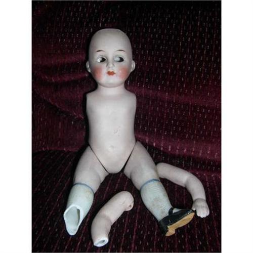 Here is an all bisque #208 made by Hertel, Schwab & Co. Unfortunately, she has a broken arm and leg with pieces missing. The doll is marked 208 and so are all the limbs. There is one just a slight rub on cheek. She needs glass eyes also. I have not cleaned or done anything to her. She is as received. Undamaged she books at $500 so if you can fix her up, she will be a great doll. She is sold as is. It is from a smoke free environment. Buyer to pay $10 for shipping, insurance and handling. Thanks for viewing.