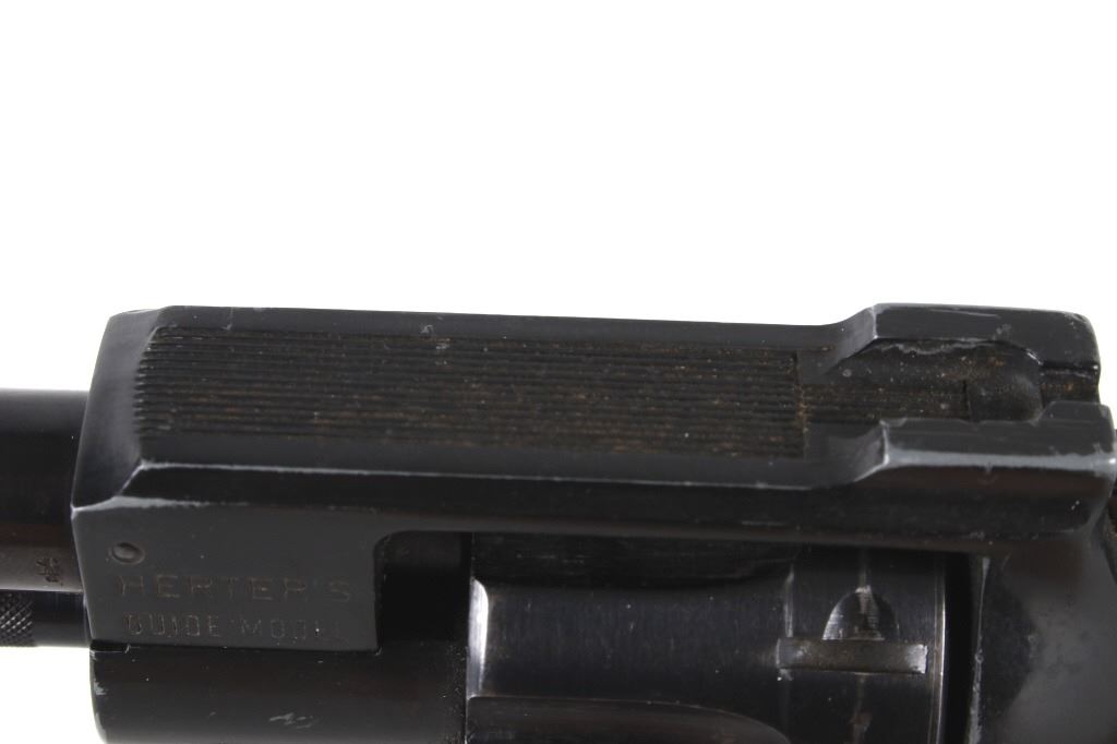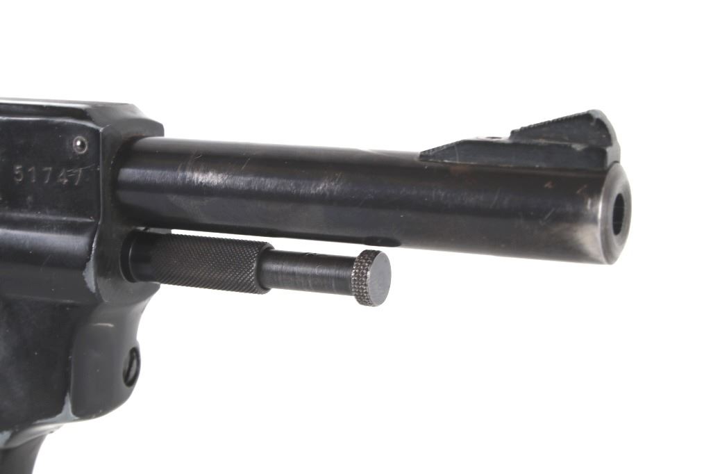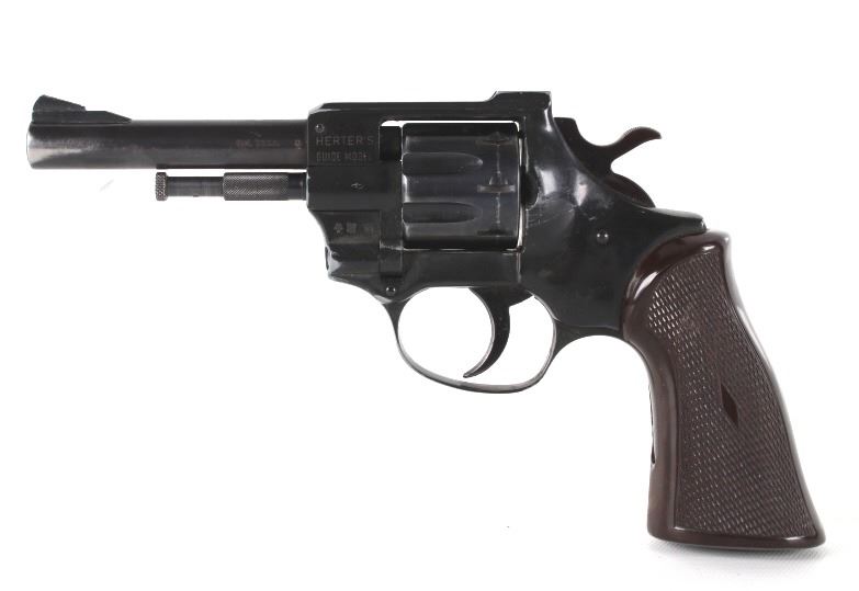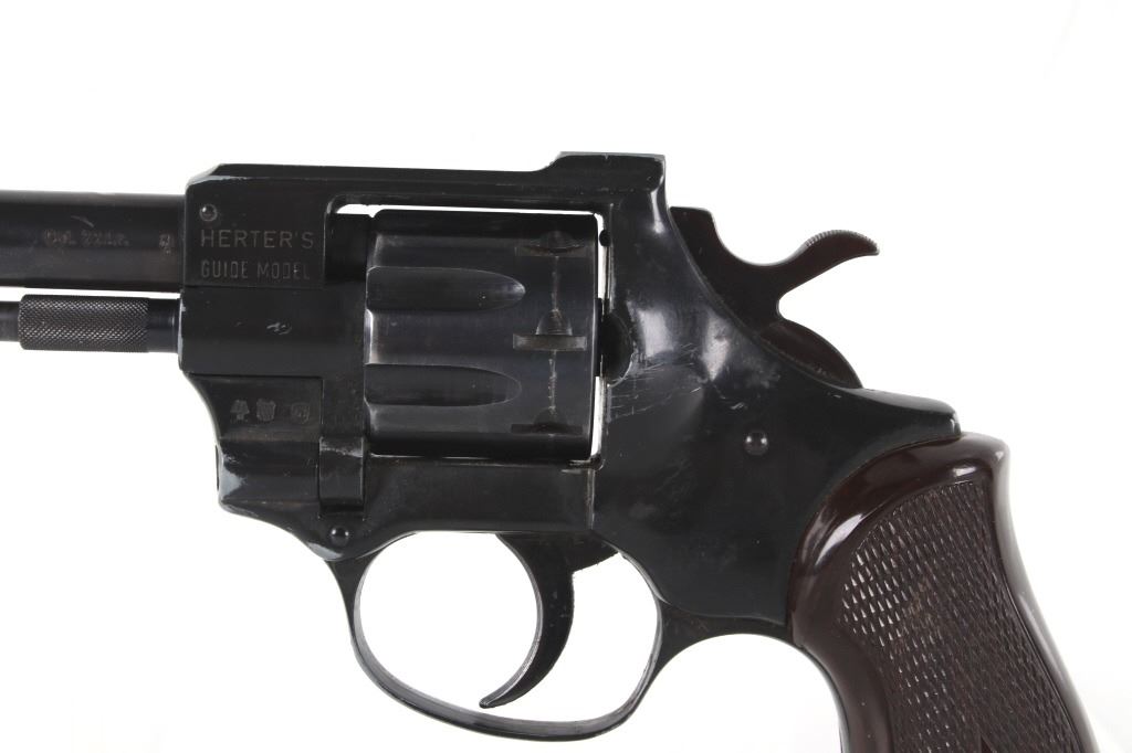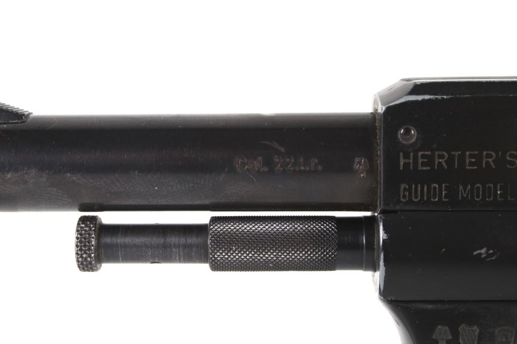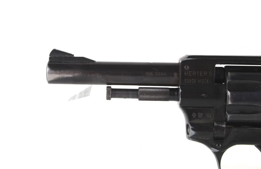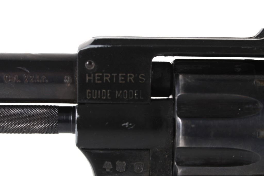 Featured in this lot we have a Herter's Guide Model 22 8 shot double action revolver chambered in .22 LR. This Herter's Guide Model revolver was manufactured by the German firm Weihrauch in 1965 under the name Arminius HW-7 with the imported models marked as Herter's Guide Model. This piece features a 4" long round barrel, 8 shot cylinder, checkered plastic grips, double action system, and cylinder release combined with the ejector rod. The revolver is marked across the left side of the barrel and frame reading "Cal. 22 L.R. Herter's Guide Model" with four total import stamps and the right side marked with "Made in Germany" along with the serial number. The revolver must be fired in double action with a safety design preventing the hammer from engaging the trigger when its cocked back into prime position. The grips show good clear checkered pattern and is a single piece. This revolver is one of the few 8 shot revolvers models. The piece shows good mechanical condition with a clean trigger pull and crisp cylinder rotation. The pistol shows some wear due to age and use with holster and use wear across the dark finish. The revolver weighs 1lbs 10oz. Serial Number: 51747. This firearm qualifies as a Curio & Relic firearm, and requires FFL Transfer or NICS Background Check.*
