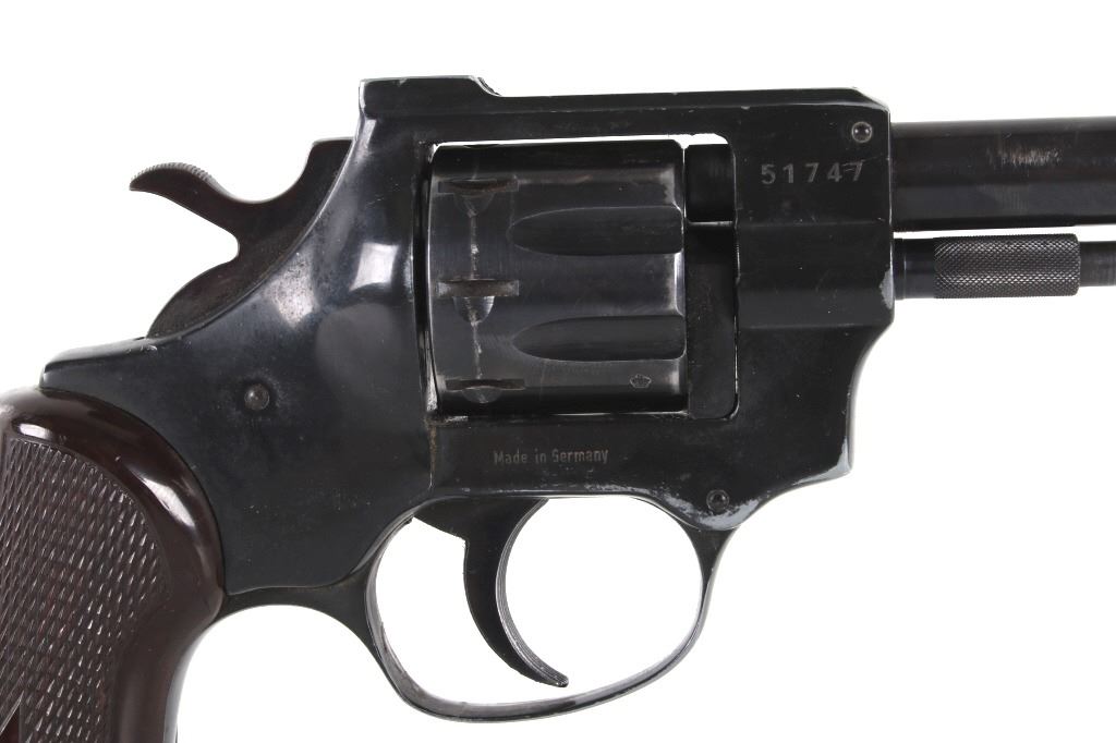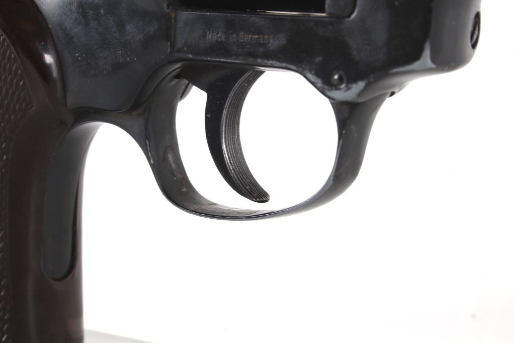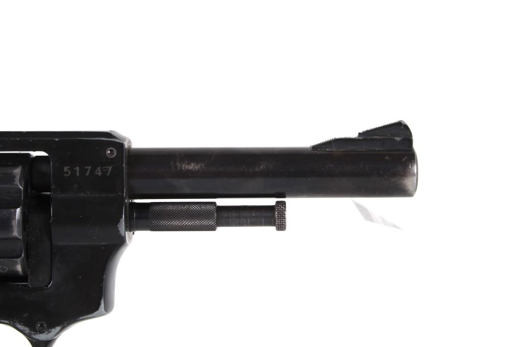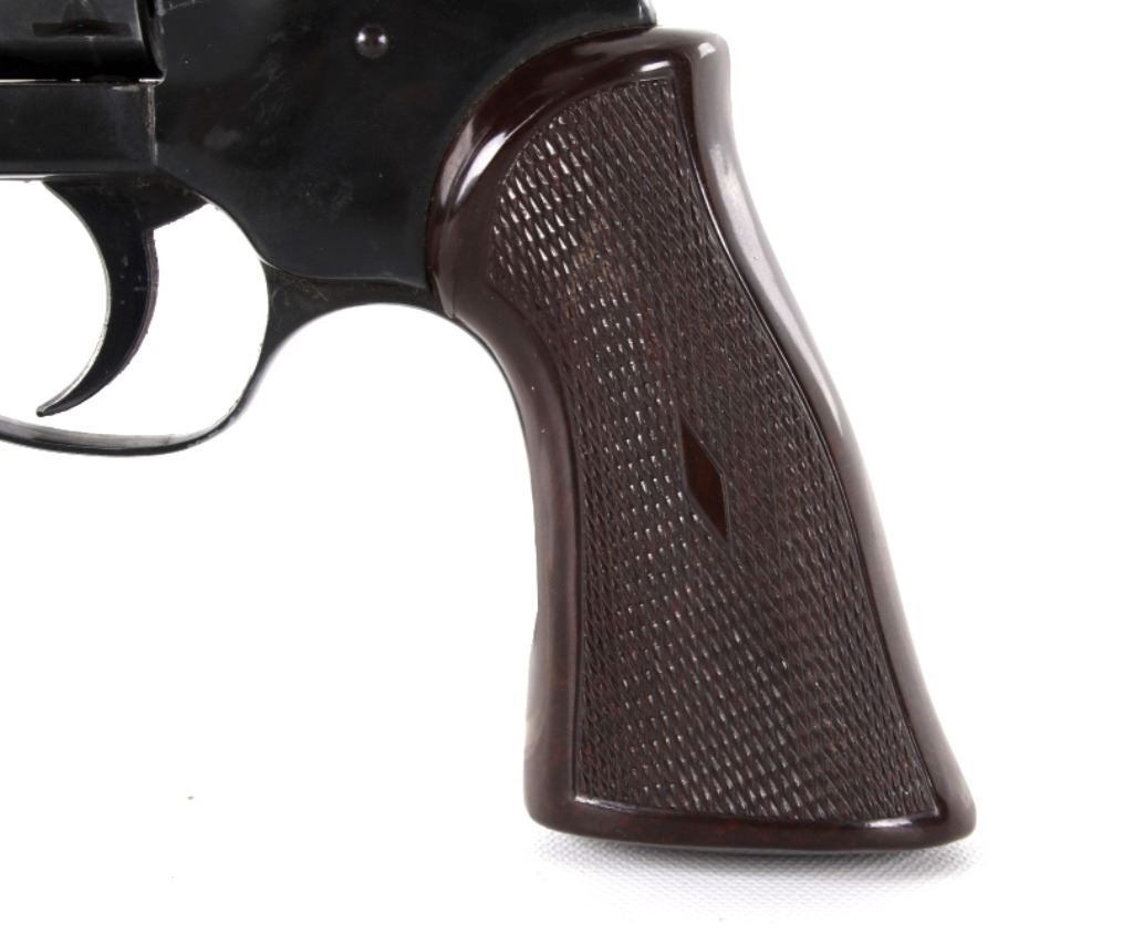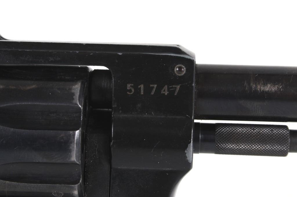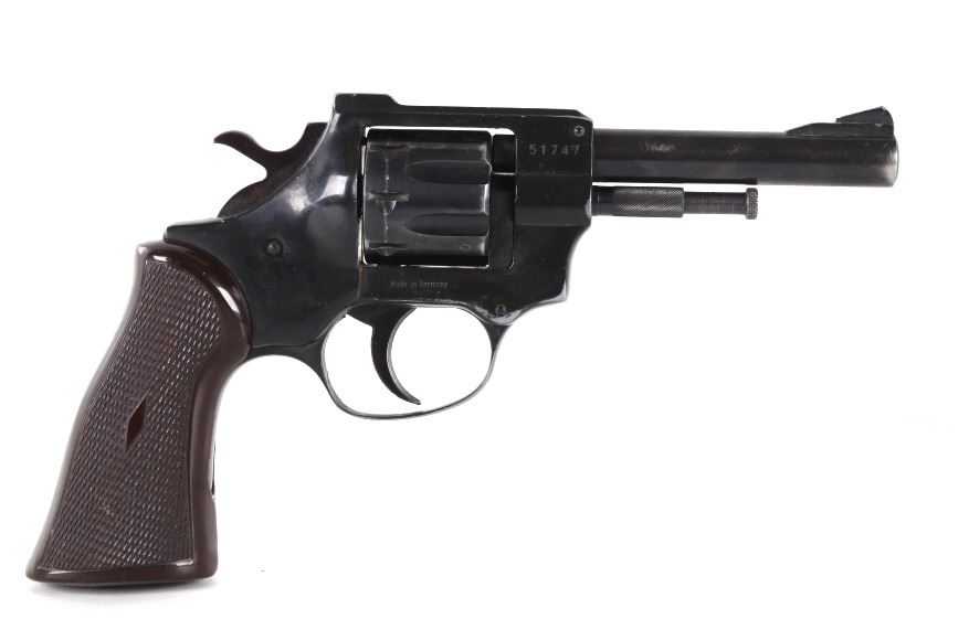 Featured in this lot we have a Herter's Guide Model 22 8 shot double action revolver chambered in .22 LR. This Herter's Guide Model revolver was manufactured by the German firm Weihrauch in 1965 under the name Arminius HW-7 with the imported models marked as Herter's Guide Model. This piece features a 4" long round barrel, 8 shot cylinder, checkered plastic grips, double action system, and cylinder release combined with the ejector rod. The revolver is marked across the left side of the barrel and frame reading "Cal. 22 L.R. Herter's Guide Model" with four total import stamps and the right side marked with "Made in Germany" along with the serial number. The revolver must be fired in double action with a safety design preventing the hammer from engaging the trigger when its cocked back into prime position. The grips show good clear checkered pattern and is a single piece. This revolver is one of the few 8 shot revolvers models. The piece shows good mechanical condition with a clean trigger pull and crisp cylinder rotation. The pistol shows some wear due to age and use with holster and use wear across the dark finish. The revolver weighs 1lbs 10oz. Serial Number: 51747. This firearm qualifies as a Curio & Relic firearm, and requires FFL Transfer or NICS Background Check.*