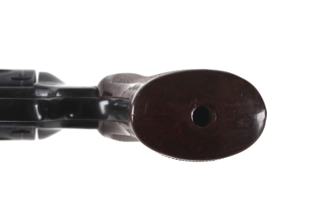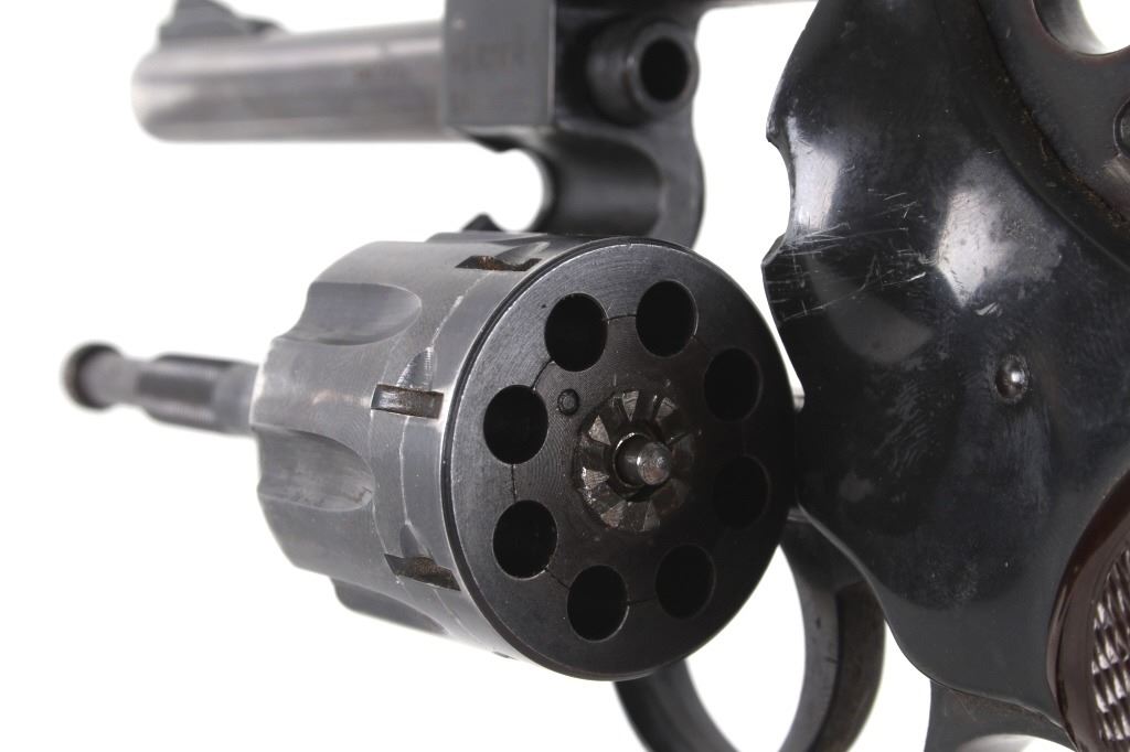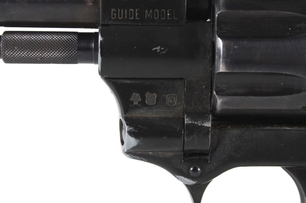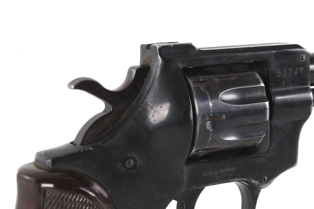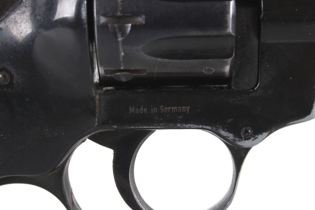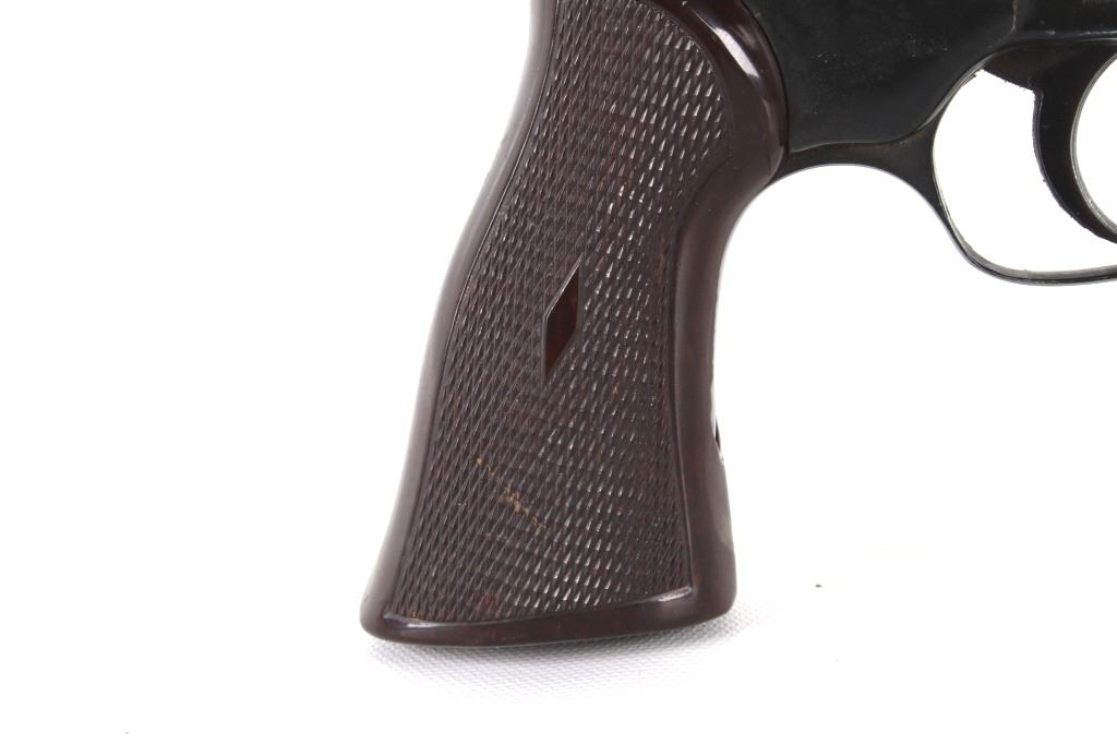 Featured in this lot we have a Herter's Guide Model 22 8 shot double action revolver chambered in .22 LR. This Herter's Guide Model revolver was manufactured by the German firm Weihrauch in 1965 under the name Arminius HW-7 with the imported models marked as Herter's Guide Model. This piece features a 4" long round barrel, 8 shot cylinder, checkered plastic grips, double action system, and cylinder release combined with the ejector rod. The revolver is marked across the left side of the barrel and frame reading "Cal. 22 L.R. Herter's Guide Model" with four total import stamps and the right side marked with "Made in Germany" along with the serial number. The revolver must be fired in double action with a safety design preventing the hammer from engaging the trigger when its cocked back into prime position. The grips show good clear checkered pattern and is a single piece. This revolver is one of the few 8 shot revolvers models. The piece shows good mechanical condition with a clean trigger pull and crisp cylinder rotation. The pistol shows some wear due to age and use with holster and use wear across the dark finish. The revolver weighs 1lbs 10oz. Serial Number: 51747. This firearm qualifies as a Curio & Relic firearm, and requires FFL Transfer or NICS Background Check.*