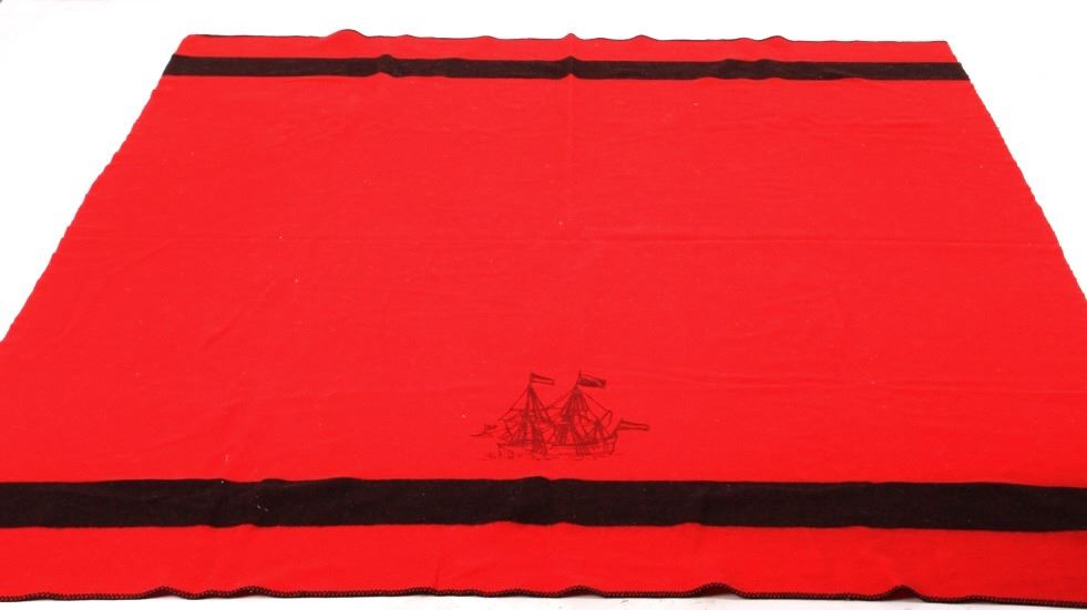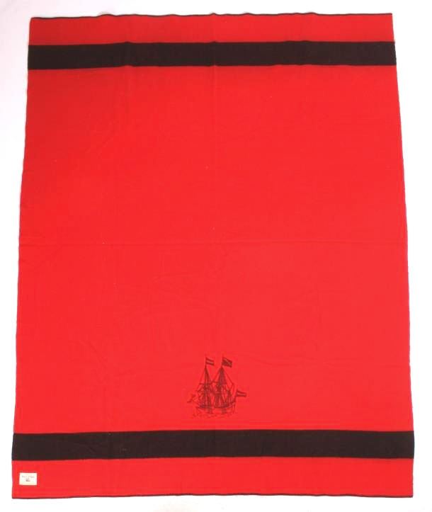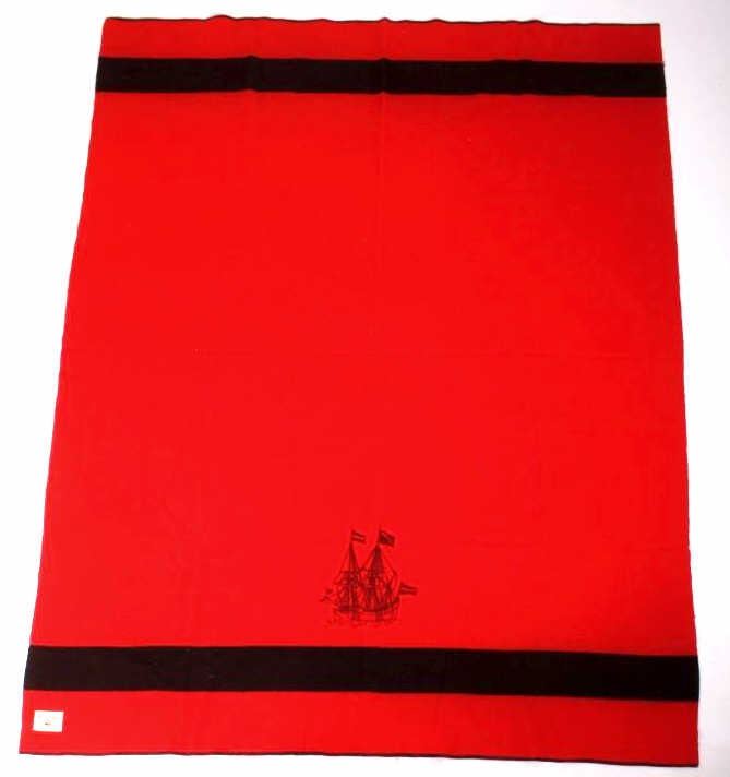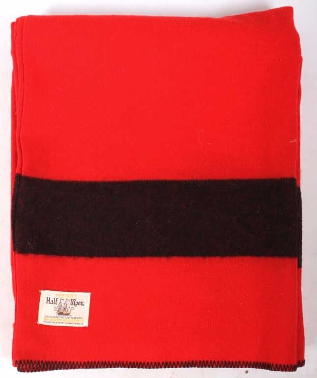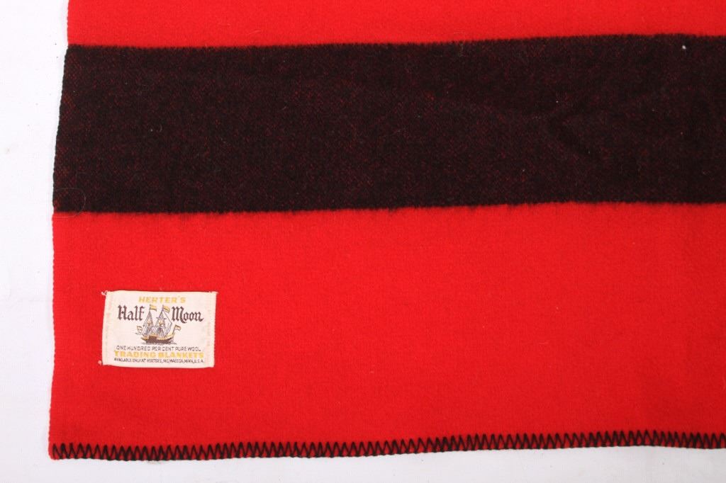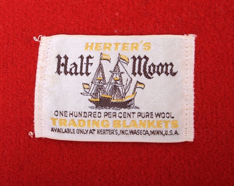 This is an original 100% wool trading blanket from Herter's Trading Co. The blanket shows the iconic red with black stripe beaver trade blanket design that was pioneered by the Hudson Bay Fur Trading Co. Tag is marked, "Herter's Half Moon One Hundred Percent Pure Wool Trading Blankets Available Only At Herter's, INC. Waseca, MINN., U.S.A.". This is in good condition and measures "x". This is an early piece from circa 1930-1950's