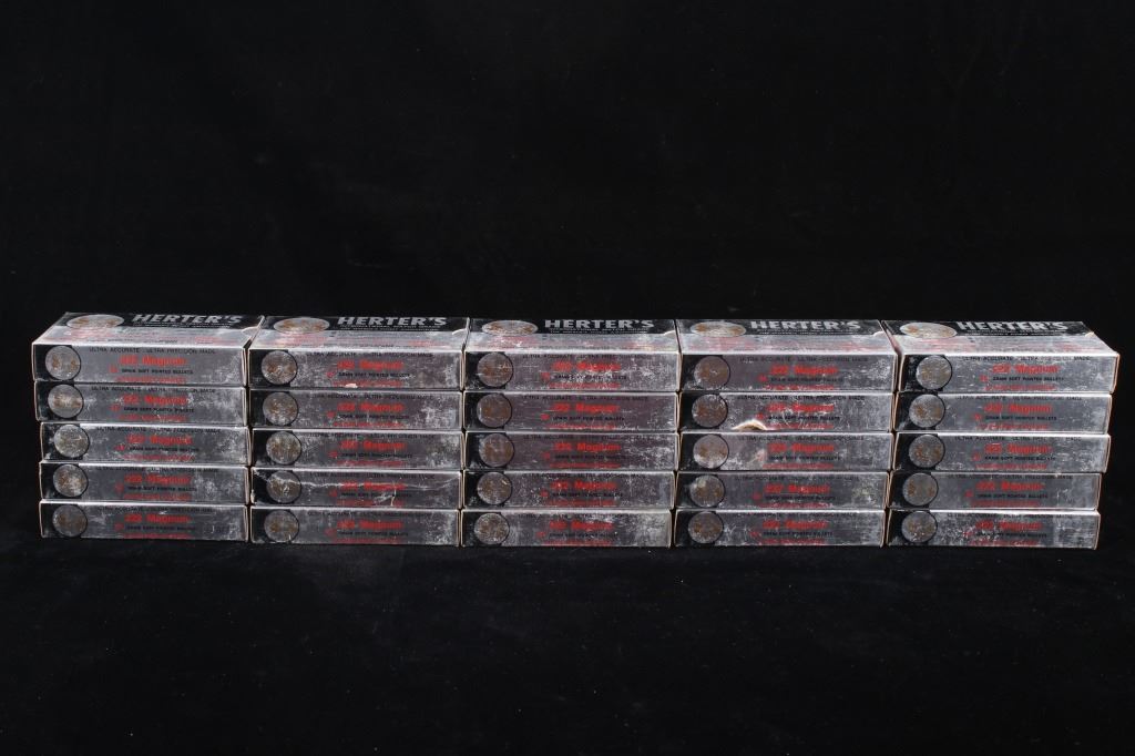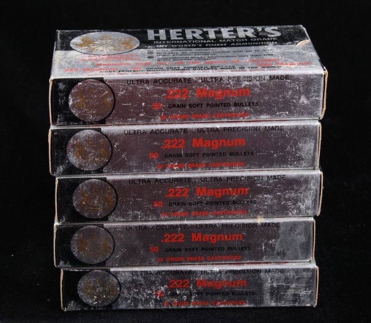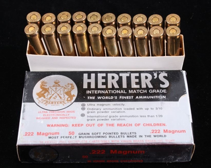 Included in this lot is a collection of Herter’s .222 Magnum 50 grain soft pointed bullets. The .222 Remington Magnum was a short-lived commercially produced cartridge derived from the .222 Remington. Originally developed for a US military prototype Armalite AR-15 rifle in 1958, the cartridge was not adopted by the military, but was introduced commercially in sporting rifles. This collection of .222 Magnum is comprised of 25 boxes of Herter’s International Match Grade 50 grain and soft pointed bullets. The boxes read 20 Virgin Brass Cartridges and measure approximately 4 ¾” x 2 ½” x 1 1/8”.