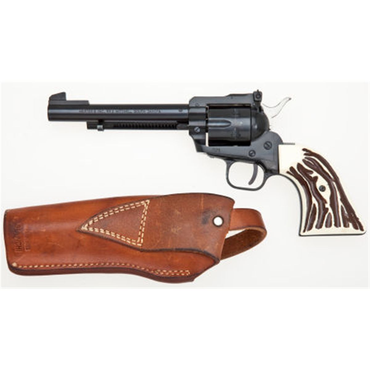 **Herter's Model 21-S Single-Action Revolver. Serial no. 622952, .22 Magnum caliber, 5 1/2-inch barrel with target sights. Blued finish. Faux stag grips. Barrel marked, "H. SCHMIDT OSTHEIM/RHOEN MADE IN W. GERMANY." Contained in fine, light brown leather holster by Bianchi. Sold together with unmarked extra cylinder.Condition: Good. Retaining approximately 90-95% original blue finish. Scuffs on ejector rod housing and tracking line on cylinder. Action smooth.