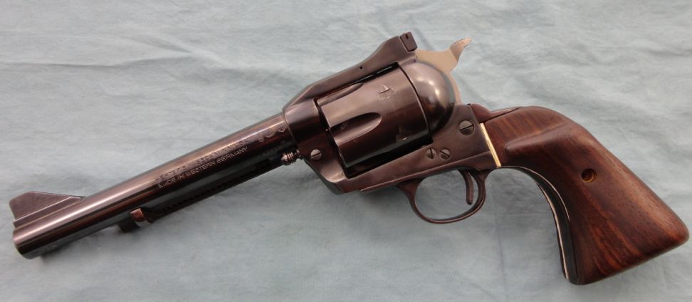 #V4220; 401 Mag. 6 1/2" bbl. Blued finish & replacement wood grips which do not fit well. Otherwise mechanically gun is good & blued finish is fine.