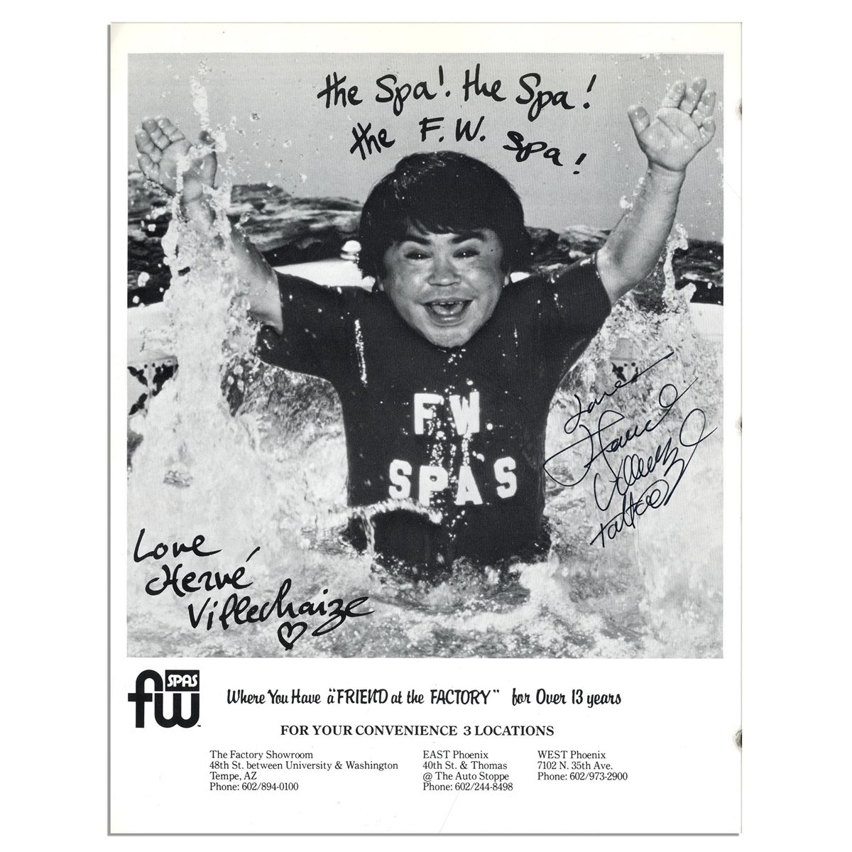 Herve Villechaize photo signed. The ''Fantasy Island'' actor who played ''Tattoo'' signs the FW Spas promotional photo ''Love / Herve / Villechaize'' in black felt tip, and adds further notations in his hand. Semi-matte photo measures 8.5'' x 11''. Near fine.