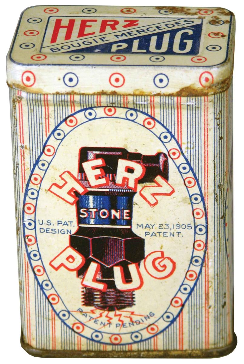 Herz Blue Enamel Stone Sparkplug Tin, patented 1905. Empty, some minor rust othewise very good condition. 1 3/4 X 2 1/2 X 1 1/8 inches. Start Price $20
