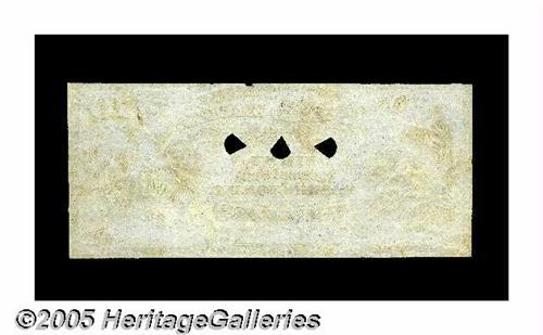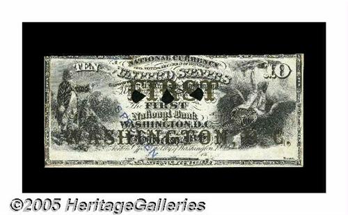 <B>Hessler /1499e $10 National Bank Note Face Design Very Choice New.</B></I> This 1863 Proof Note is of incredible importance to both National Bank Note collectors and Fractional Currency collectors. This lovely design, which was never adopted, was intended to be used for the original series $10 Nationals. This is the plate note from Gene Hessler's <I>U. S. Essay, Proof and Specimen Notes</B></I> which appears on page 147. To our best knowledge, this note is unique. Although this design was changed considerably before it was used, both vignettes are the same theme as on the adopted design: Ben Franklin and his kite at the left and America riding an eagle seizing a lighting bolt at the right. The connection between the development of this note and second issue fractional currency is a tight bond. This note is not printed on the thin proofing paper or the light card that is almost universal for large size proofs. It is printed on fiber paper, identical to that used for many of the Second Issue Experimental Notes. This $10 National also is overprinted with the bank name in bronze, "FIRST WASHINGTON, D.C." which was intended to be used as an anti-counterfeiting device. This bronze was never adopted for use on Nationals, but was used on Second Issue Fractional Notes. The bronzing experiment on Nationals was done with two different banks, this one and the Second NB of Baltimore, Md. Paper that had already been bronzed with the names of these two banks was used to print experimental and developmental notes for Second Issue Fractional Currency. That is the origin of the "Baltimore and Washington" pieces that follow. This National Essay has also been punched with the "pie wedge" cancels and stamped with the blue "SPECIMEN" stamp that Fractional collectors are familiar with. In tonight's competition to acquire this great piece, it will be interesting to see if it stays in the hands of the Fractional collecting community or leaves to reside in a National Bank Note collection.