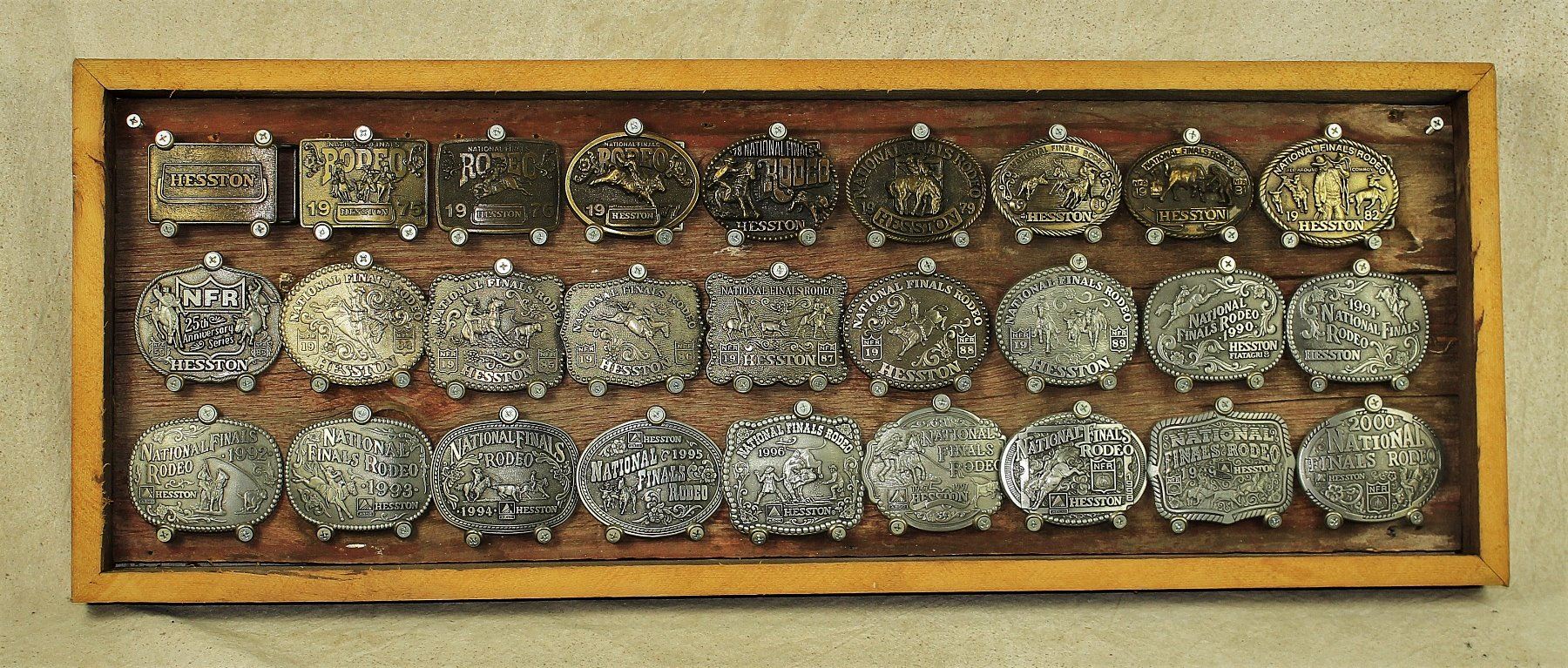 A great looking display of 27 collectable Hesston Equipment commemorative belt buckles.