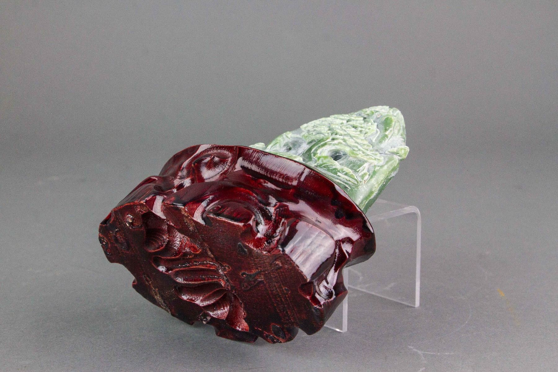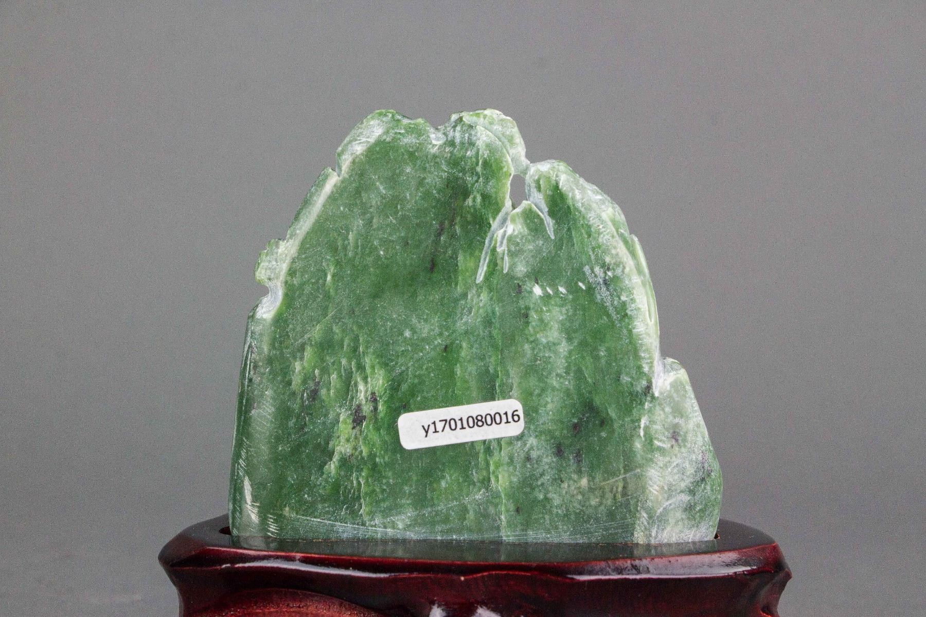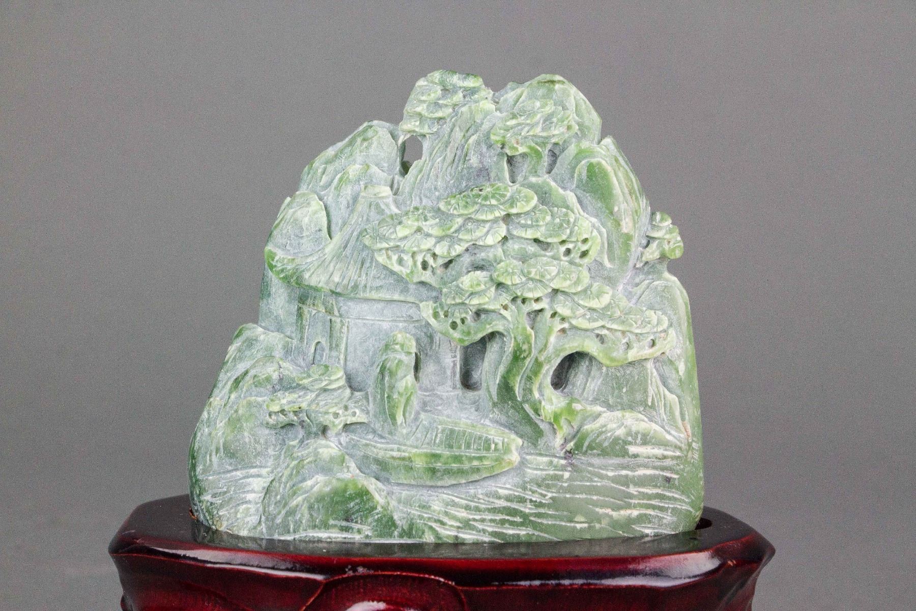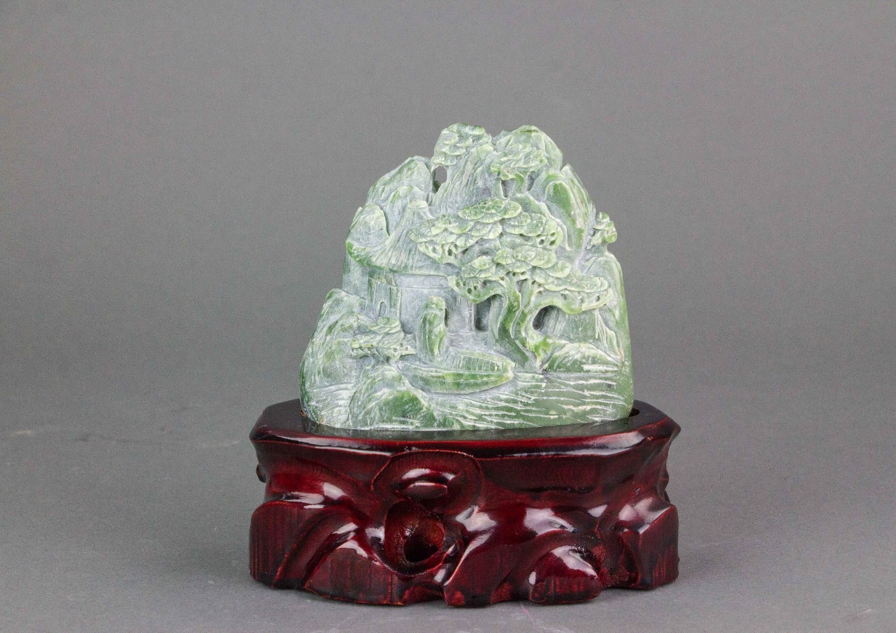 Chinese Hetian green jade nephrite carved boulder; of a mountain form; carved with landscape in high relief; accompanied with a wood stand; 13 cm x 13 cm, 575 grams (with stand)