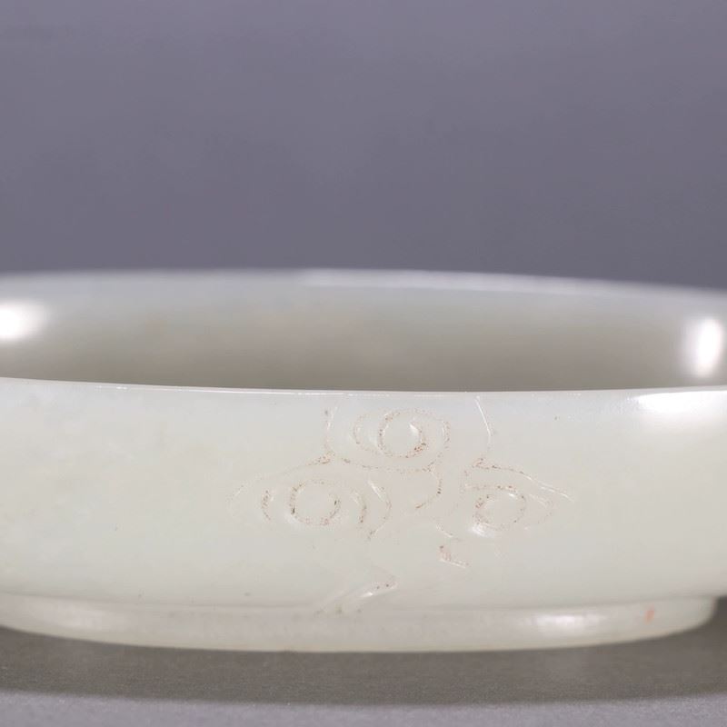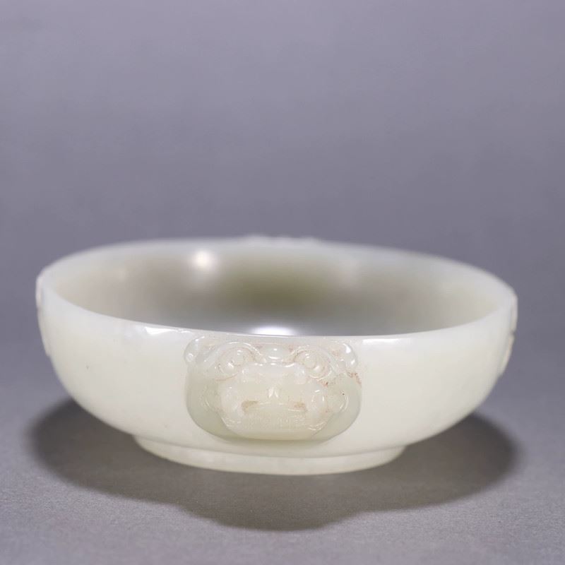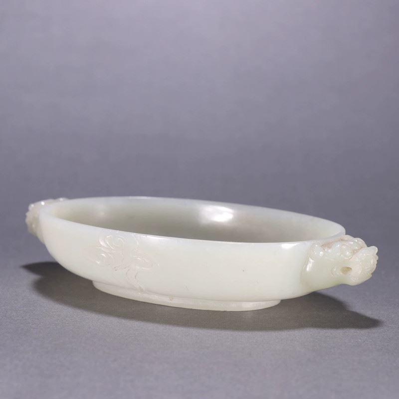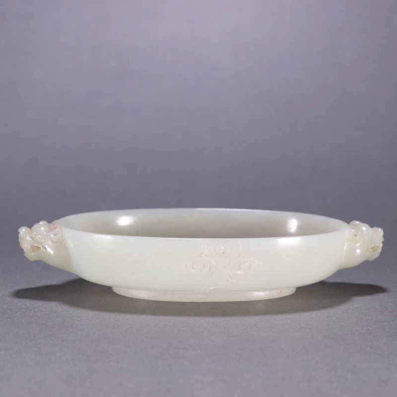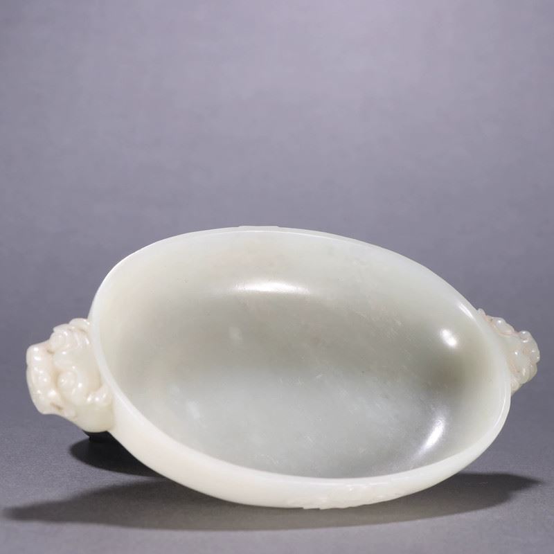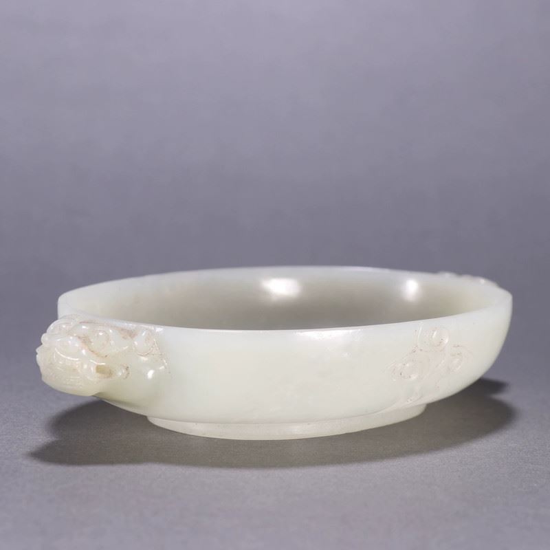 Crafted from fine Hetian jade, this brush washer is delicately sculpted with smooth, lustrous stone. The circular form is both simple and elegant, with subtly flared edges. On each side, intricately carved beast-head handles add an expressive touch to the design. The jade is a soft, pale green, with a gentle, polished surface that exudes a timeless, classic aesthetic, making it suitable for both functional and decorative use in a scholar’s study.