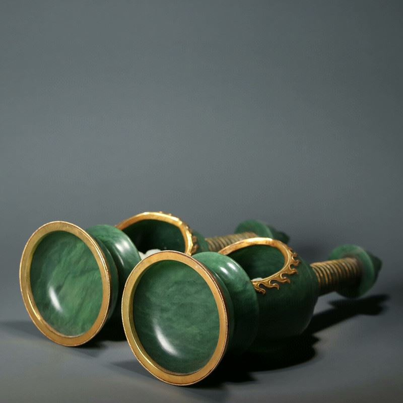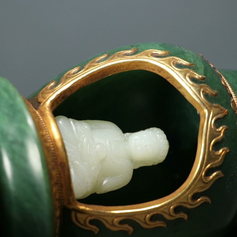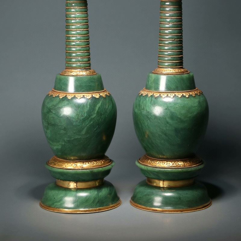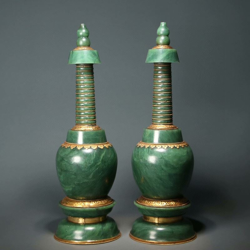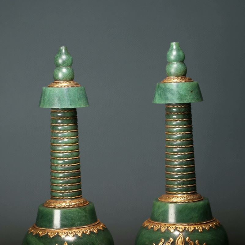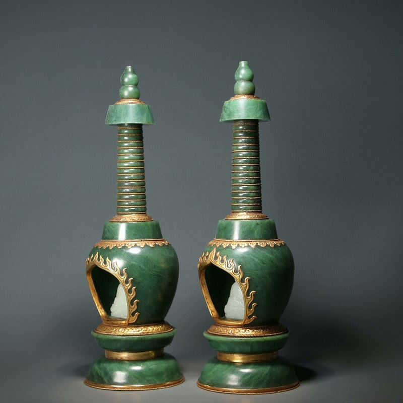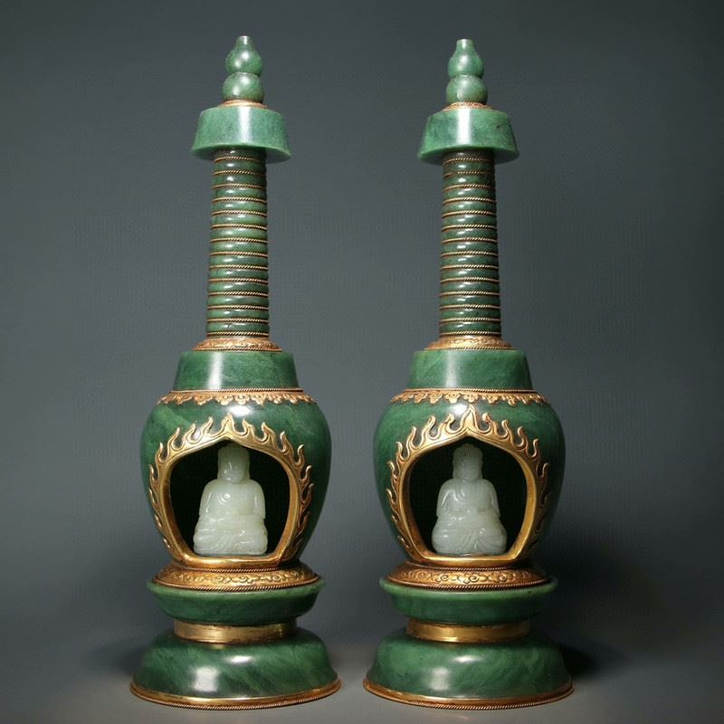 This pair of Hetian jade Buddhist pagodas from Xinjiang captivates with its exquisite carving craftsmanship and deep jade green hue. The bases of the pagodas are intricately carved from Hetian jade, with slender, elegant towers housing finely carved Buddha figures, embodying the profound essence of Buddhist culture. The gilded accents enhance the jade's rich color, emphasizing both its nobility and sacredness. The fine details of each pagoda symbolize spirituality and tranquility, making them highly valuable pieces of art and collectibles.