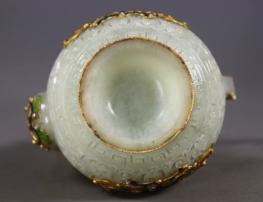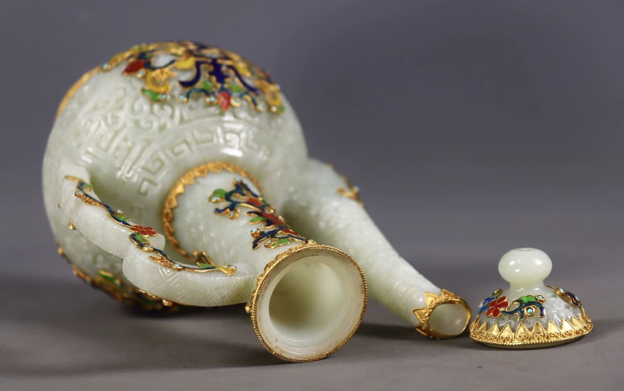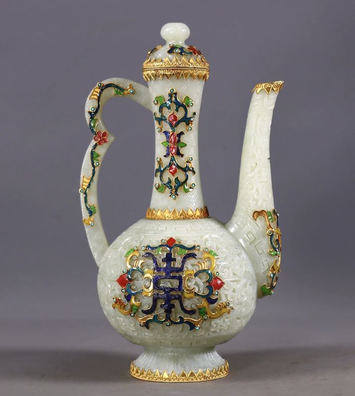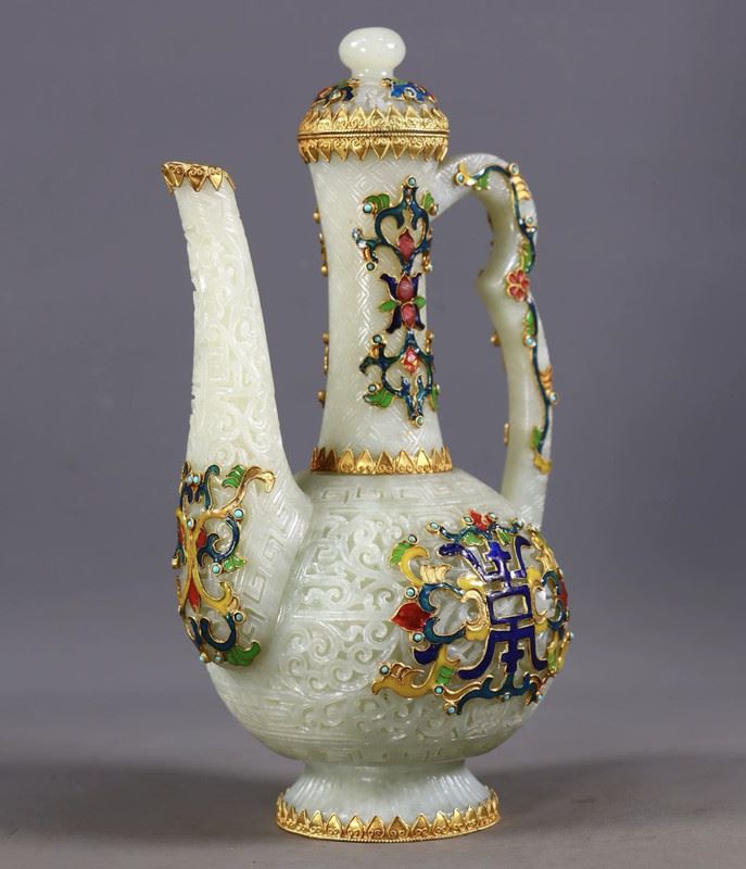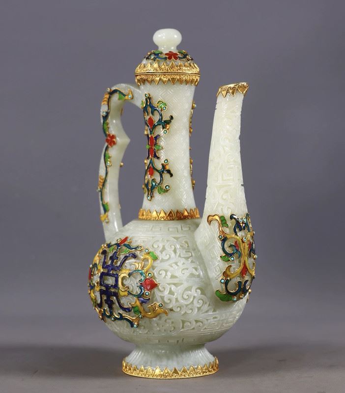 This Hetian jade ewer showcases exquisite craftsmanship, with the body sculpted from fine Hetian jade and decorated with vibrant cloisonné enamel work. The elegant gold inlays add a luxurious touch, blending traditional Chinese artistry and aesthetics. The spout and handle are adorned with intricate floral patterns, symbolizing wealth and good fortune, making the piece not only a functional item but also a highly valuable artistic treasure.