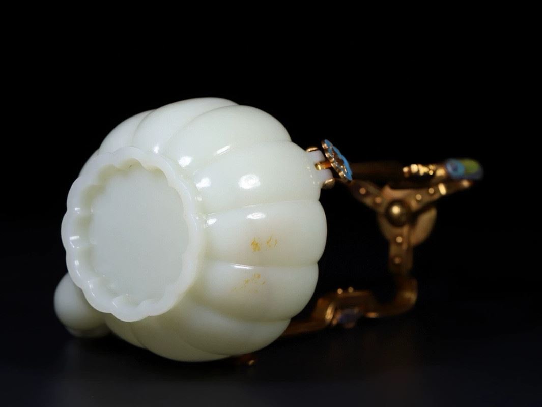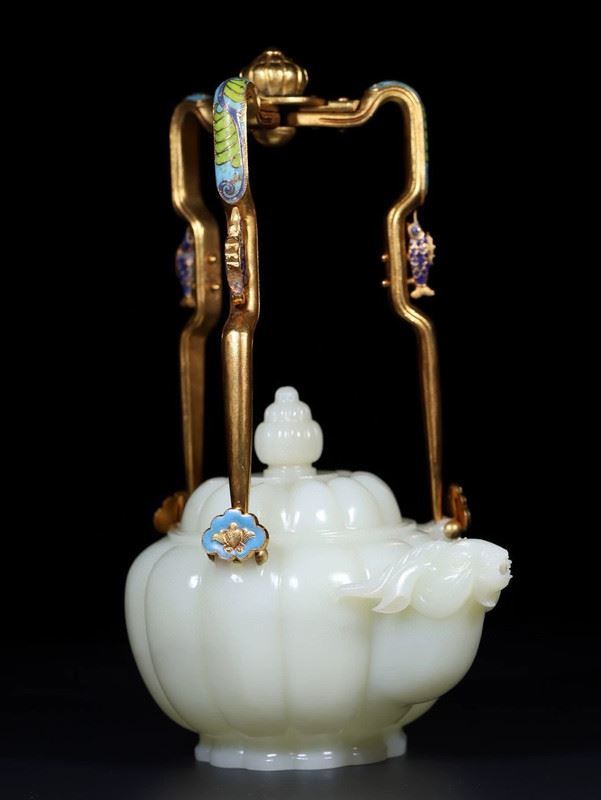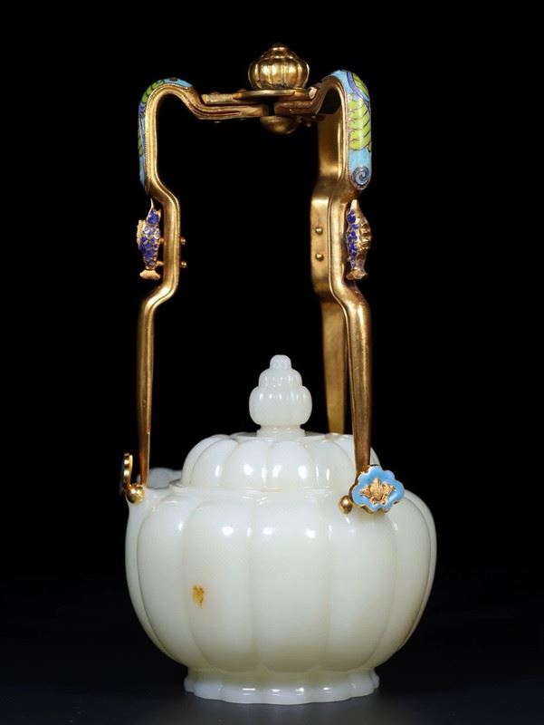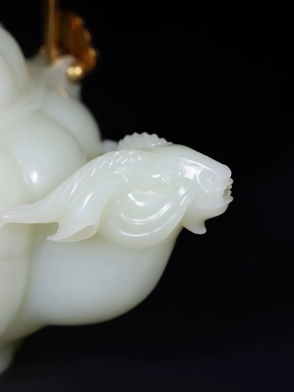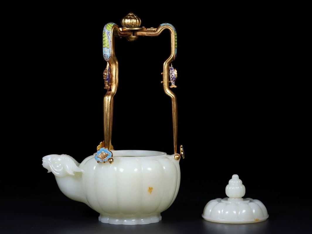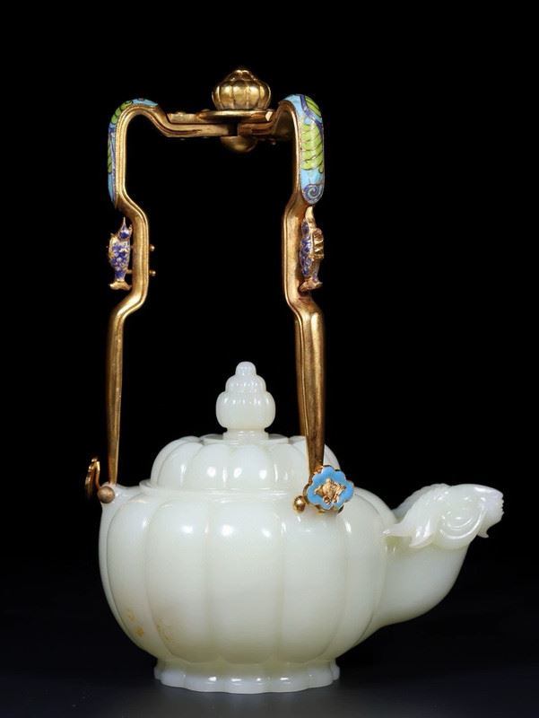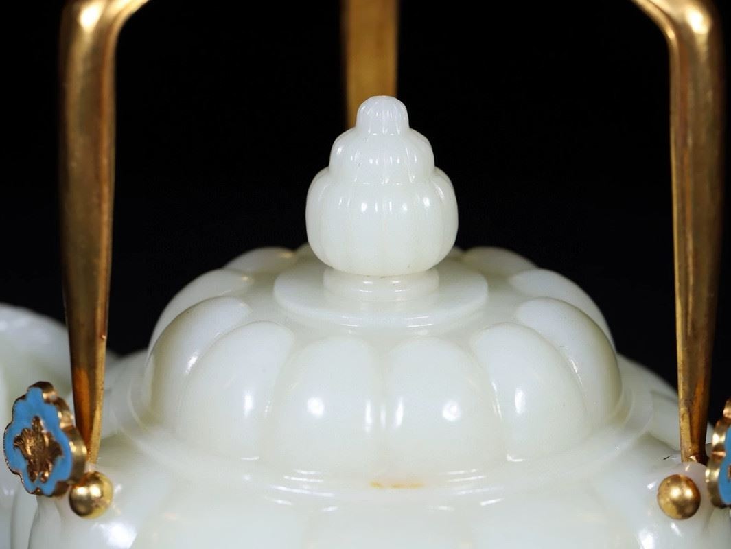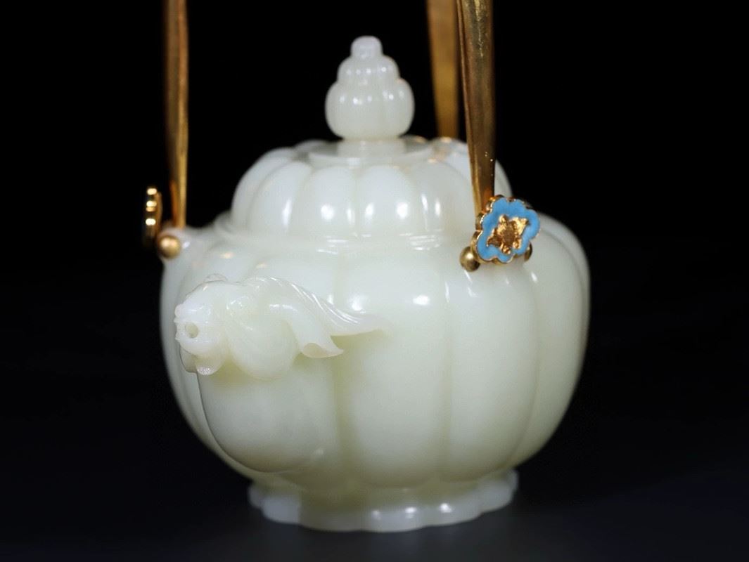 This Hetian jade gilded silver handle ram-head teapot combines the smooth texture of Hetian jade with exquisite gilded silver craftsmanship, showcasing the elegance and luxury of traditional art. The body of the teapot is intricately carved from Hetian jade, with a full and delicate shape, and a smooth, polished surface. The handle is made of silver, gilded with gold and adorned with a unique ram-head design, adding distinctive charm to the teapot. The spout and lid are finely detailed, and the overall design is both functional and artistic, making it a highly collectible piece of art.